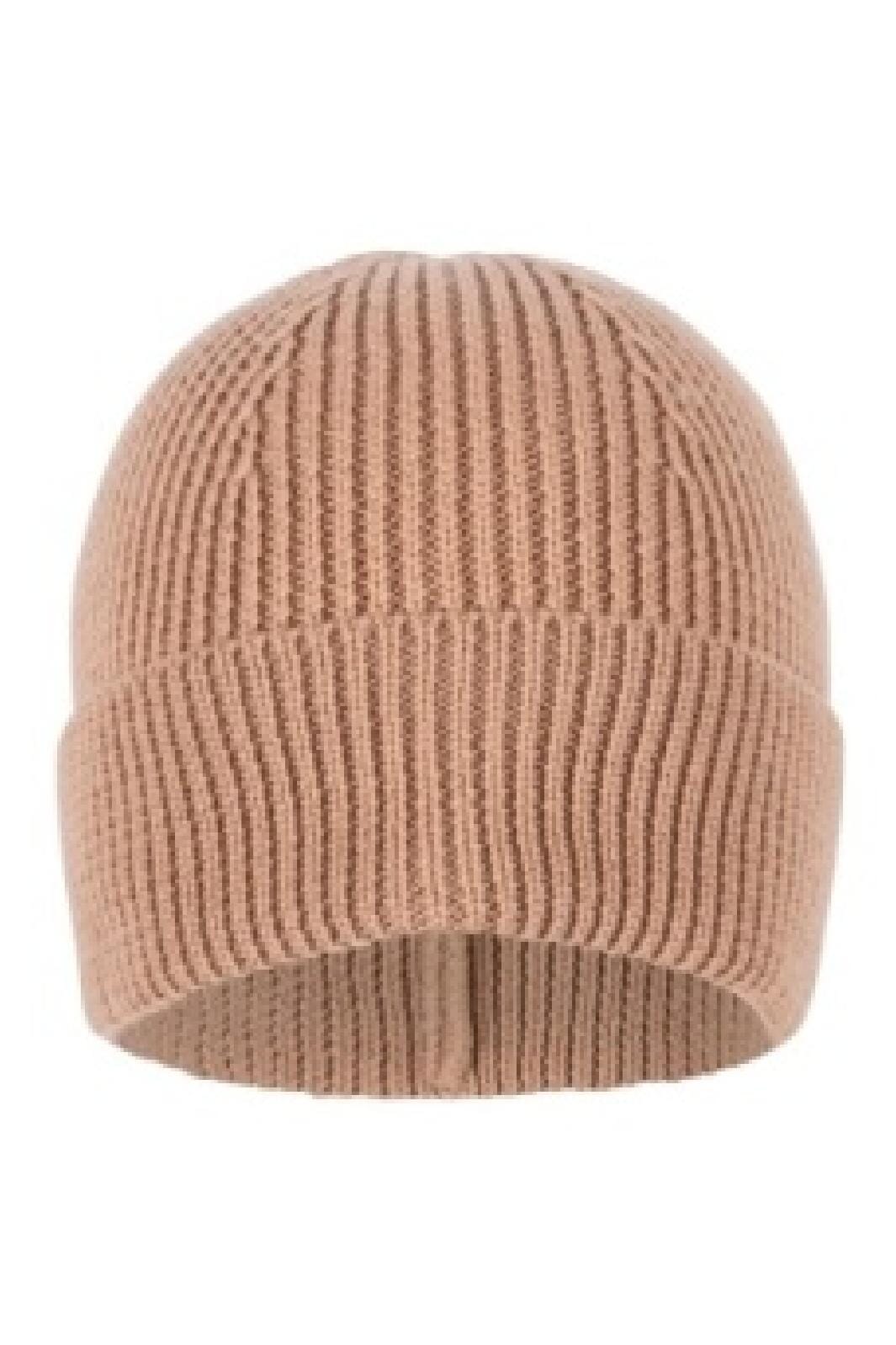 Sweter od Konges Sløjd w jasnobrązowym kolorze. Czapka ma prążkowaną strukturę i zawinięty brzeg, co zapewnia dobre dopasowanie.
