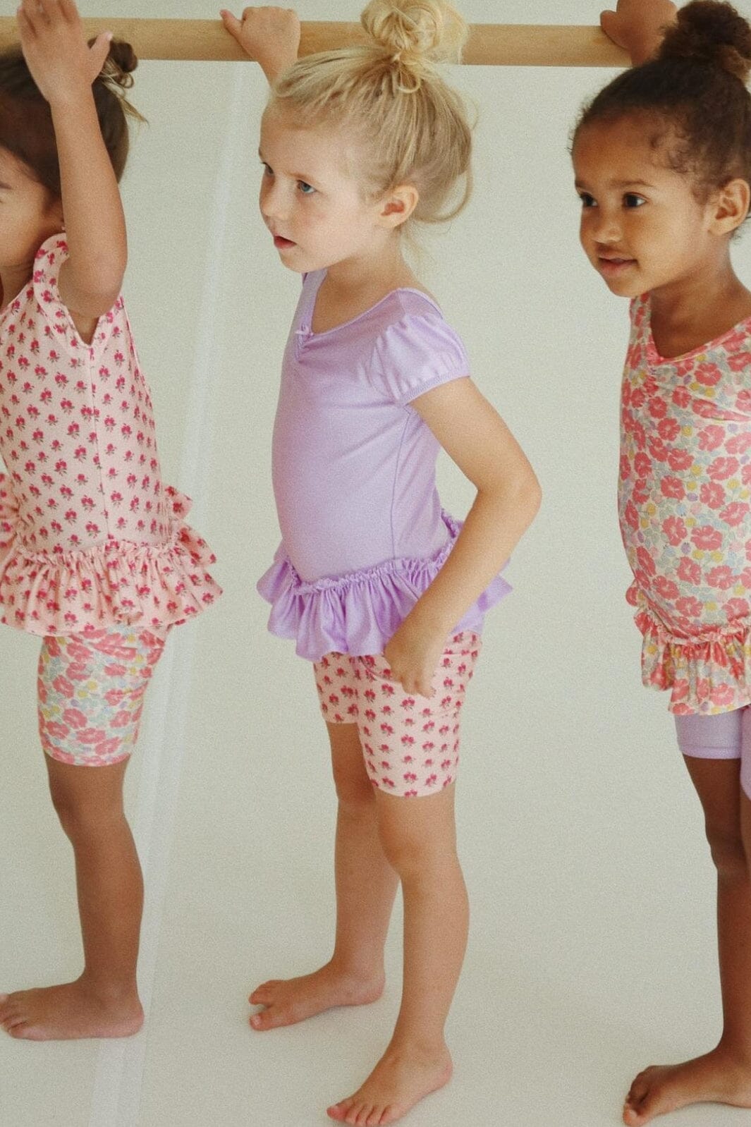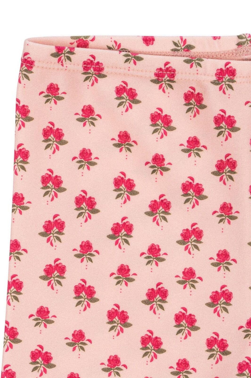 Krótkie legginsy od Konges Sløjd z różowym wzorem kwiatowym i detalami w falbanki. Materiał ma dopasowany krój i sięga do połowy uda.