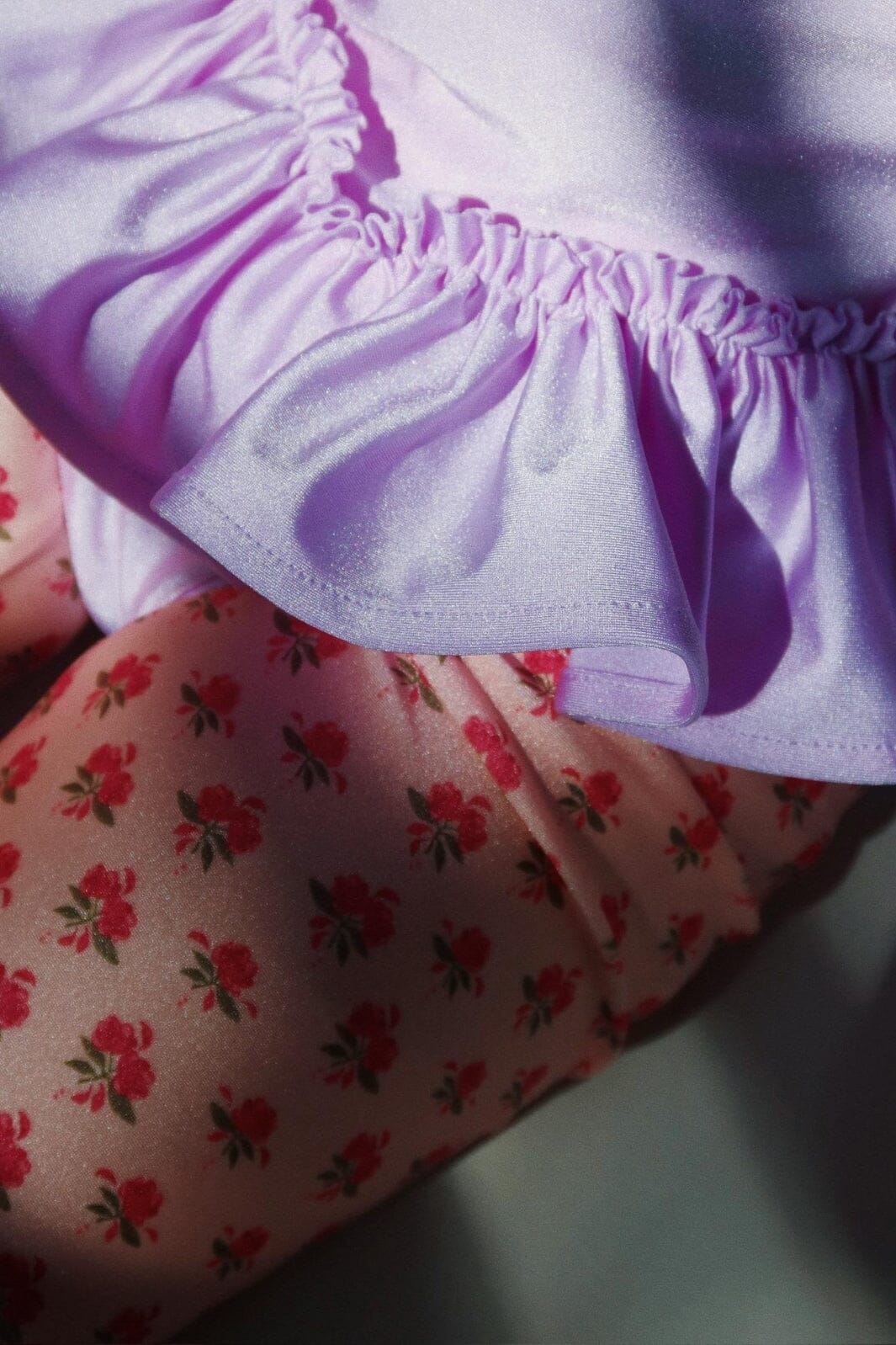 Różowy materiał ma piękny wzór róż i falbanki, które nadają legginsom letni charakter.