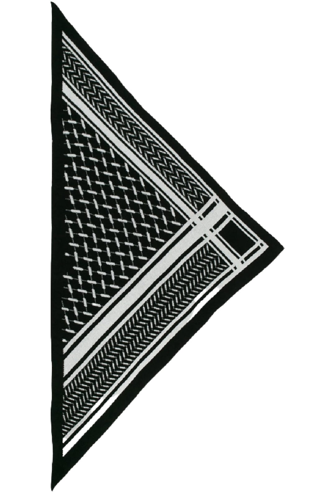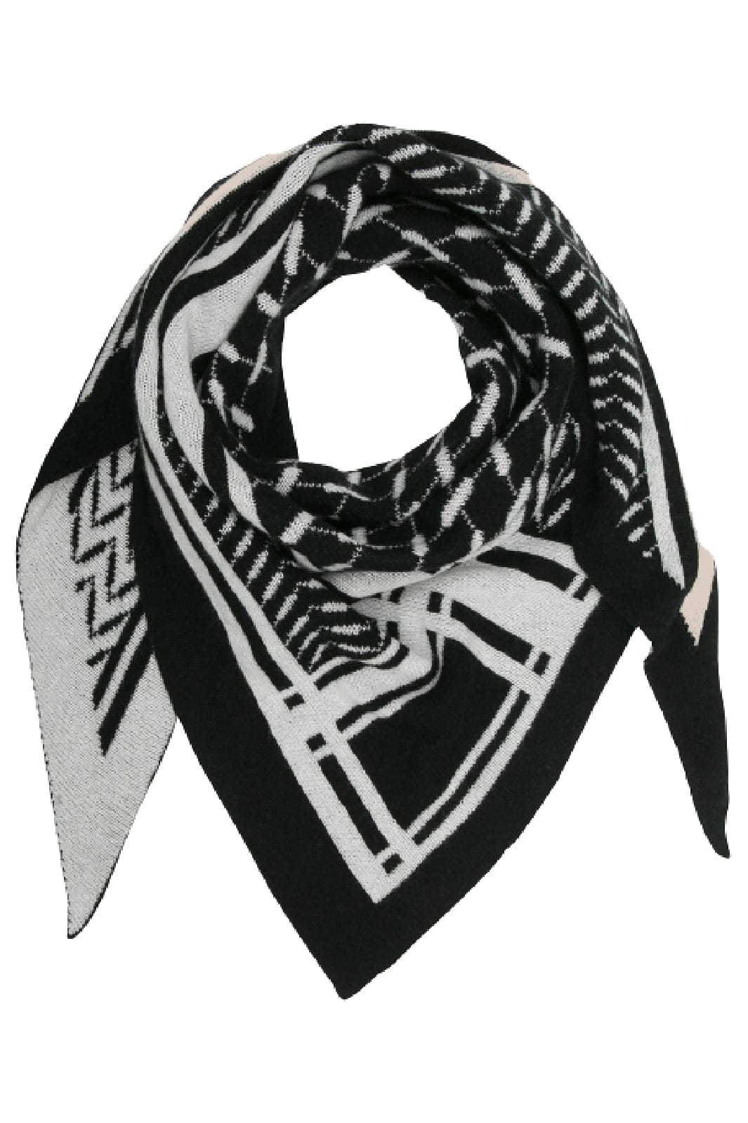 Trójkątny szalik od Lala Berlin w czerni i bieli. Szalik ma geometryczny wzór i jest wykonany z miękkiego kaszmiru, który nie drapie skóry.