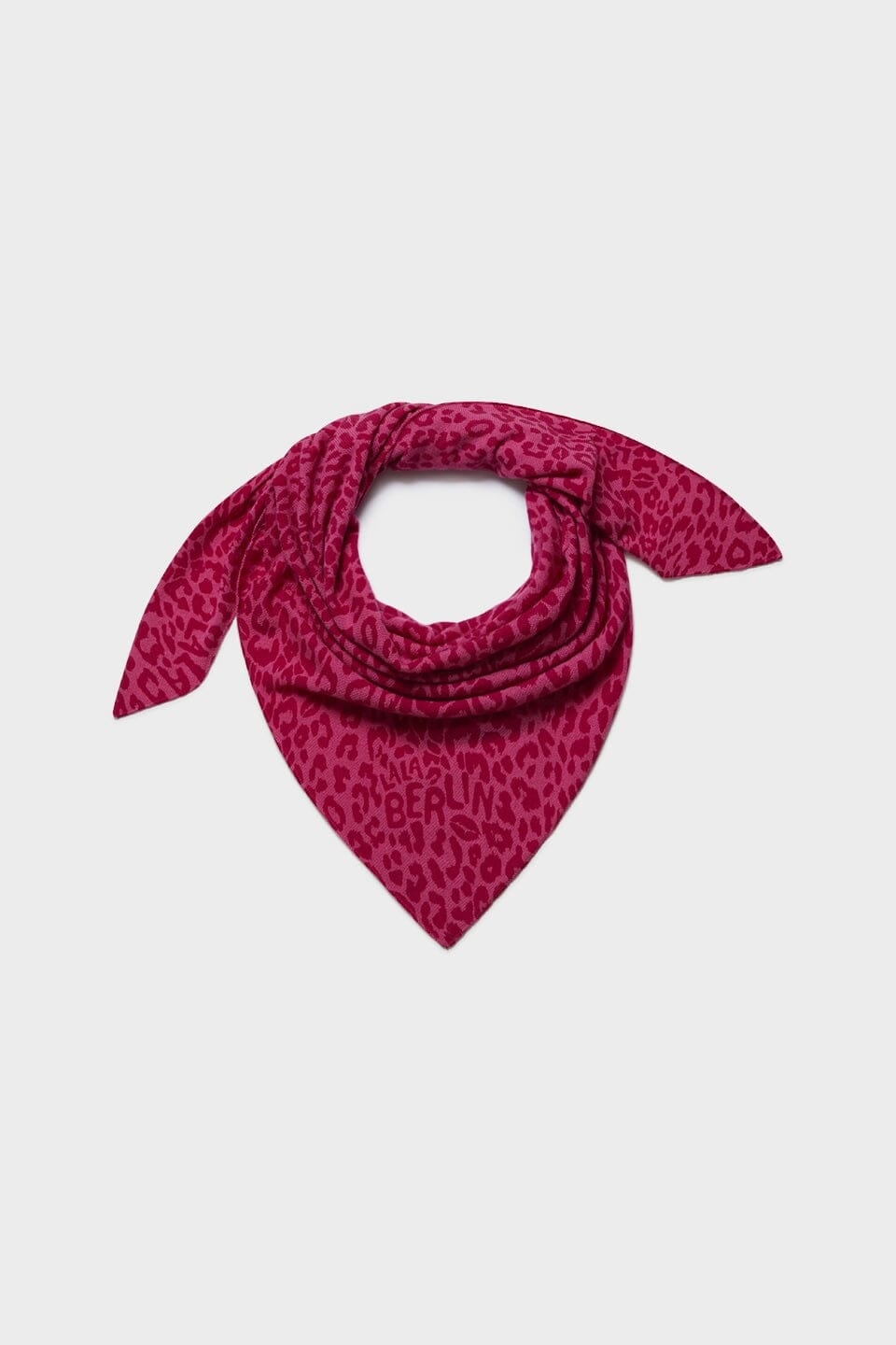 Trójkątna chusta od Lala Berlin, wykonana z drukowanego kaszmiru z różowym wzorem w panterę. Projekt łączy miękki komfort ze śmiałym wyrazem.