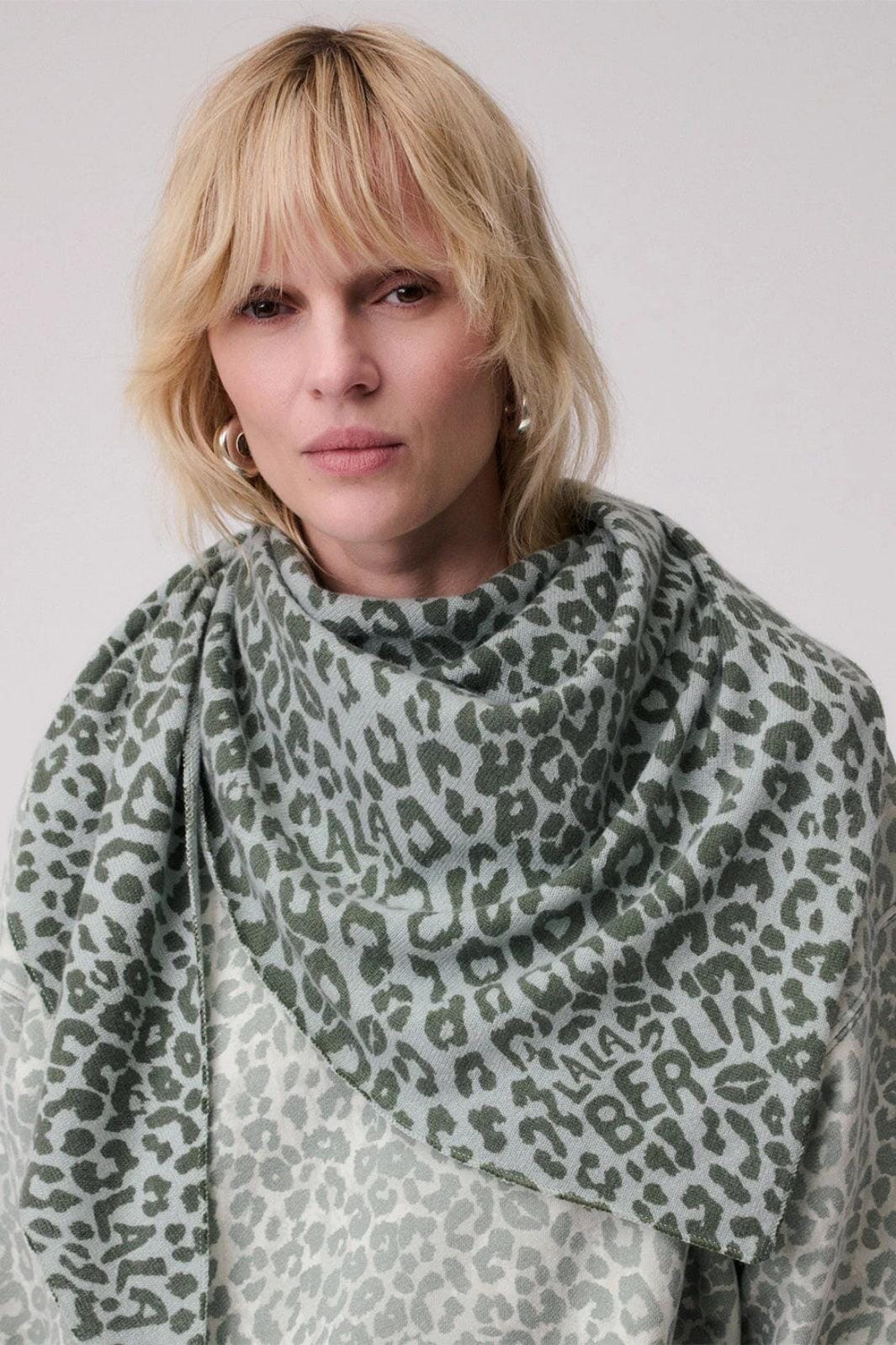 Trójkątna chusta od Lala Berlin, wykonana z drukowanego kaszmiru z wzorem w panterkę w zielonych odcieniach. Chusta ma trójkątny kształt oraz branding Lala Berlin.