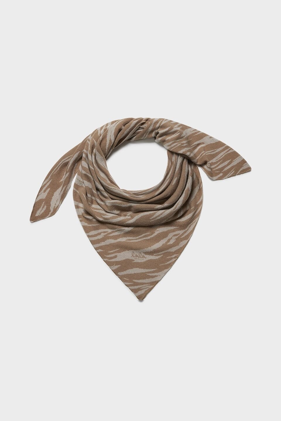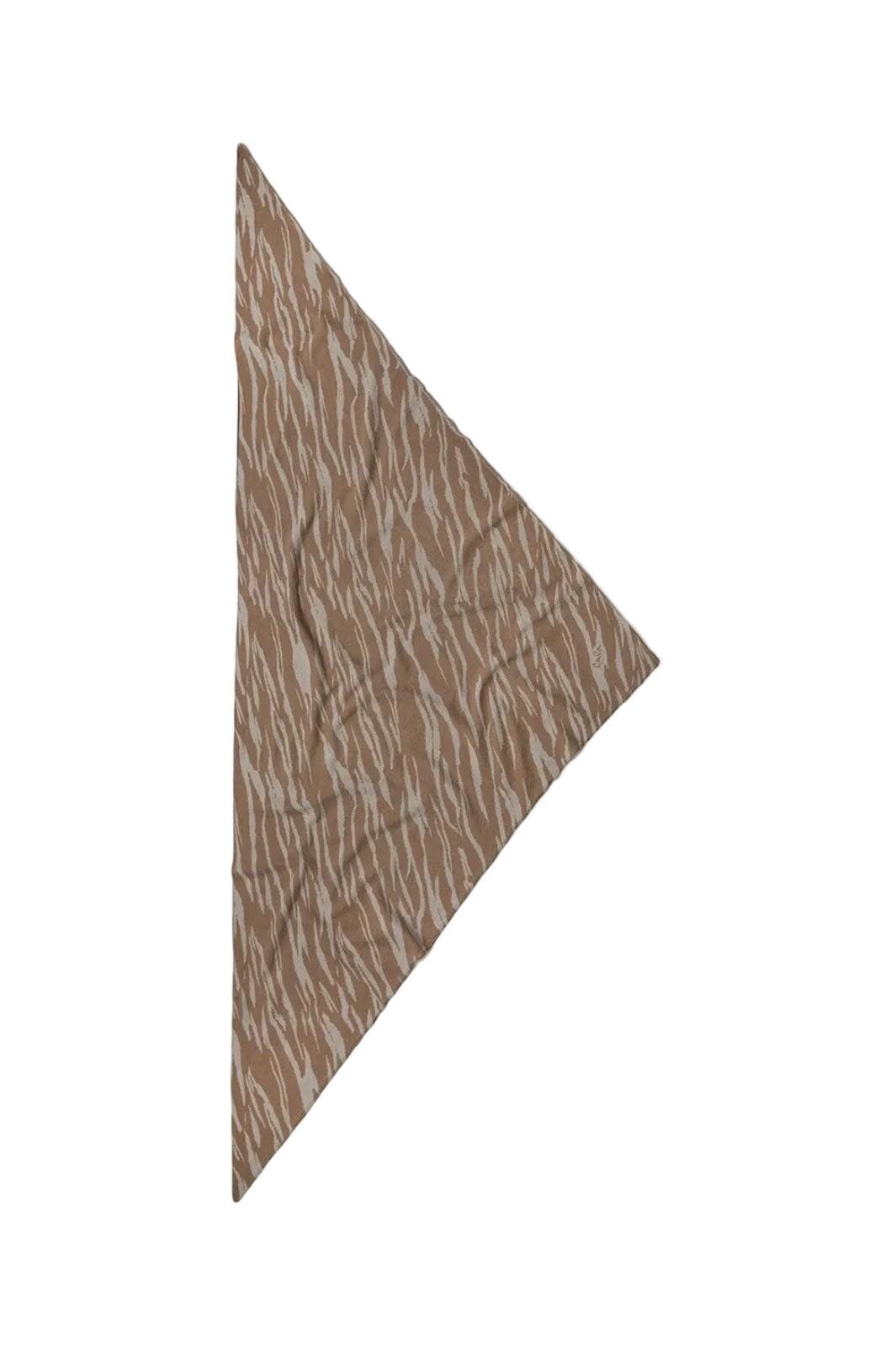 Trójkątna chusta od Lala Berlin z nadrukowanego kaszmiru. Wzór ma falujące, przypominające tygrysa pasy w piaskowym i brązowym odcieniu na beżowym tle.
