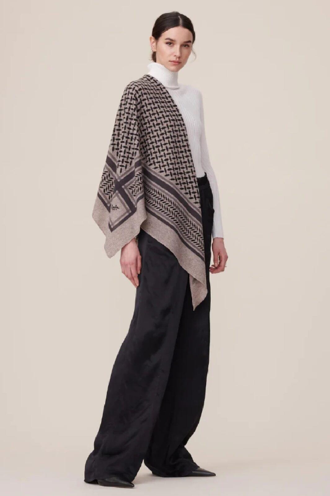 Trójkątny szalik od Lala Berlin w brązowym melanżu. Duży szalik z charakterystycznym wzorem Kufiya na brązowym tle. Szalik wykonany jest z kaszmiru.