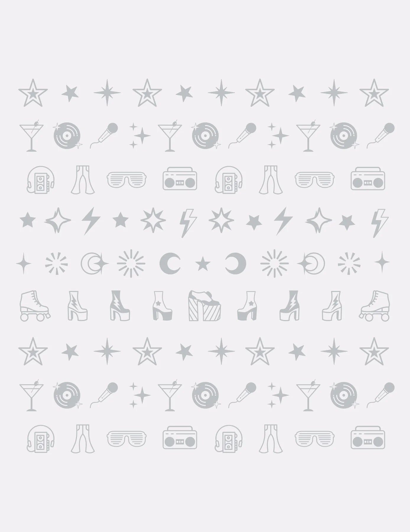 Mini naklejki do paznokci od Le Mini Macaron z festiwalowymi motywami takimi jak kule dyskotekowe, płyty winylowe i rolki w odcieniach szarości.