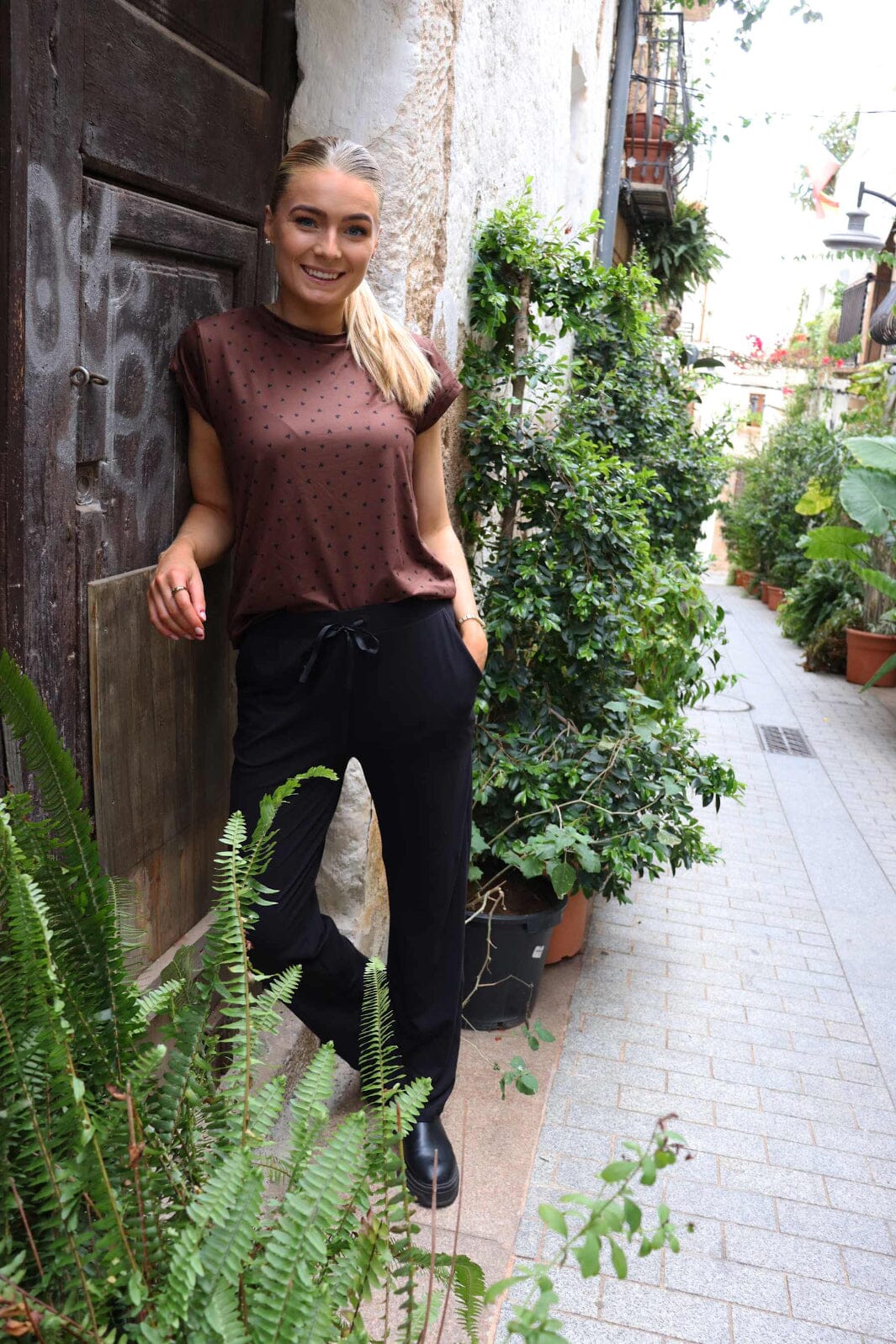 T-shirt od Liberte z czarnymi sercami nadrukowanymi na brązowym tle. Ma krótkie rękawy i okrągły dekolt.