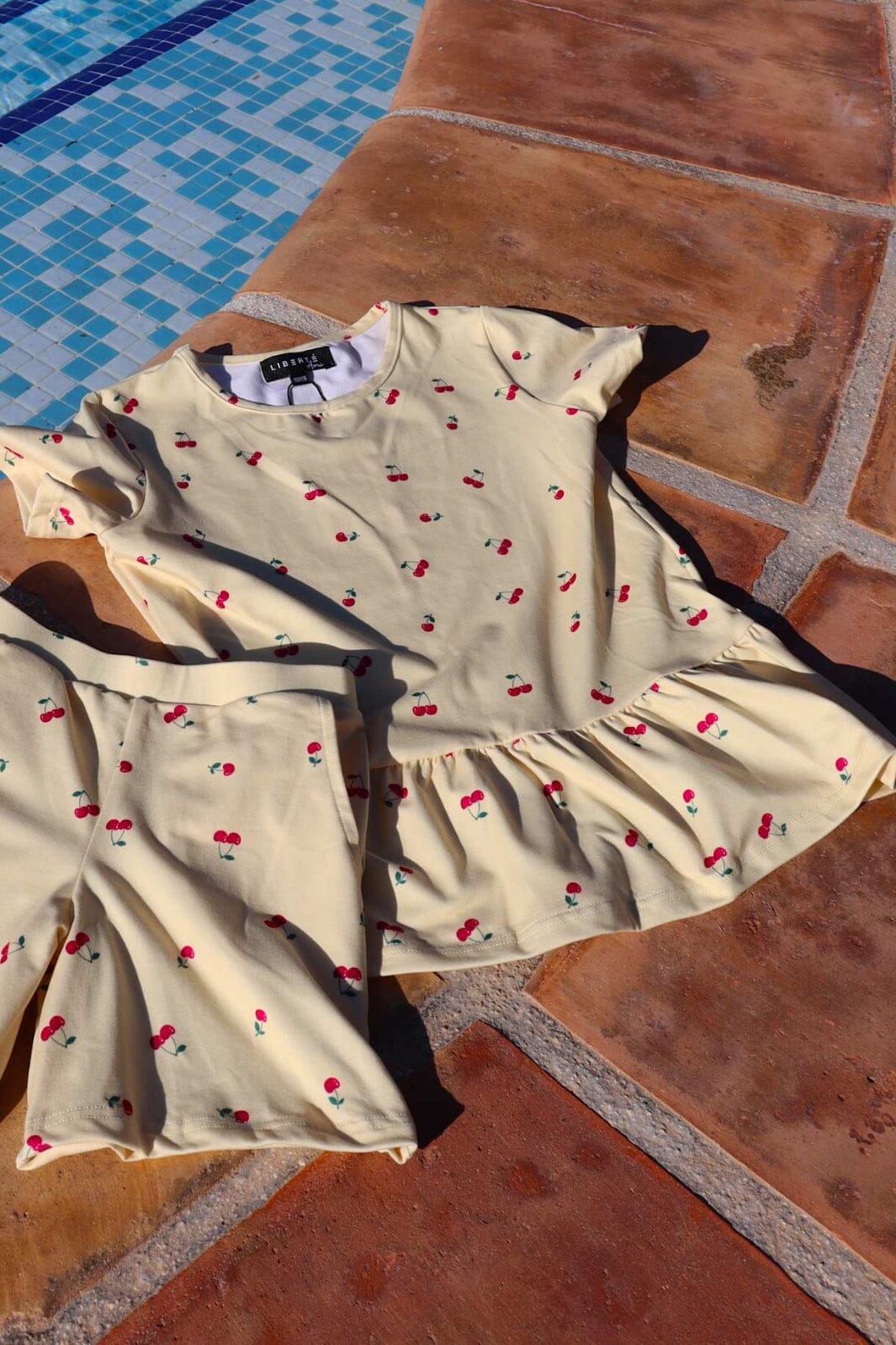 Żółta koszulka od Liberte Ami w miękkiej jakości Alma. Ma słodki wzór wiśni i falbanę na dole, co nadaje koszulce ładny wygląd.