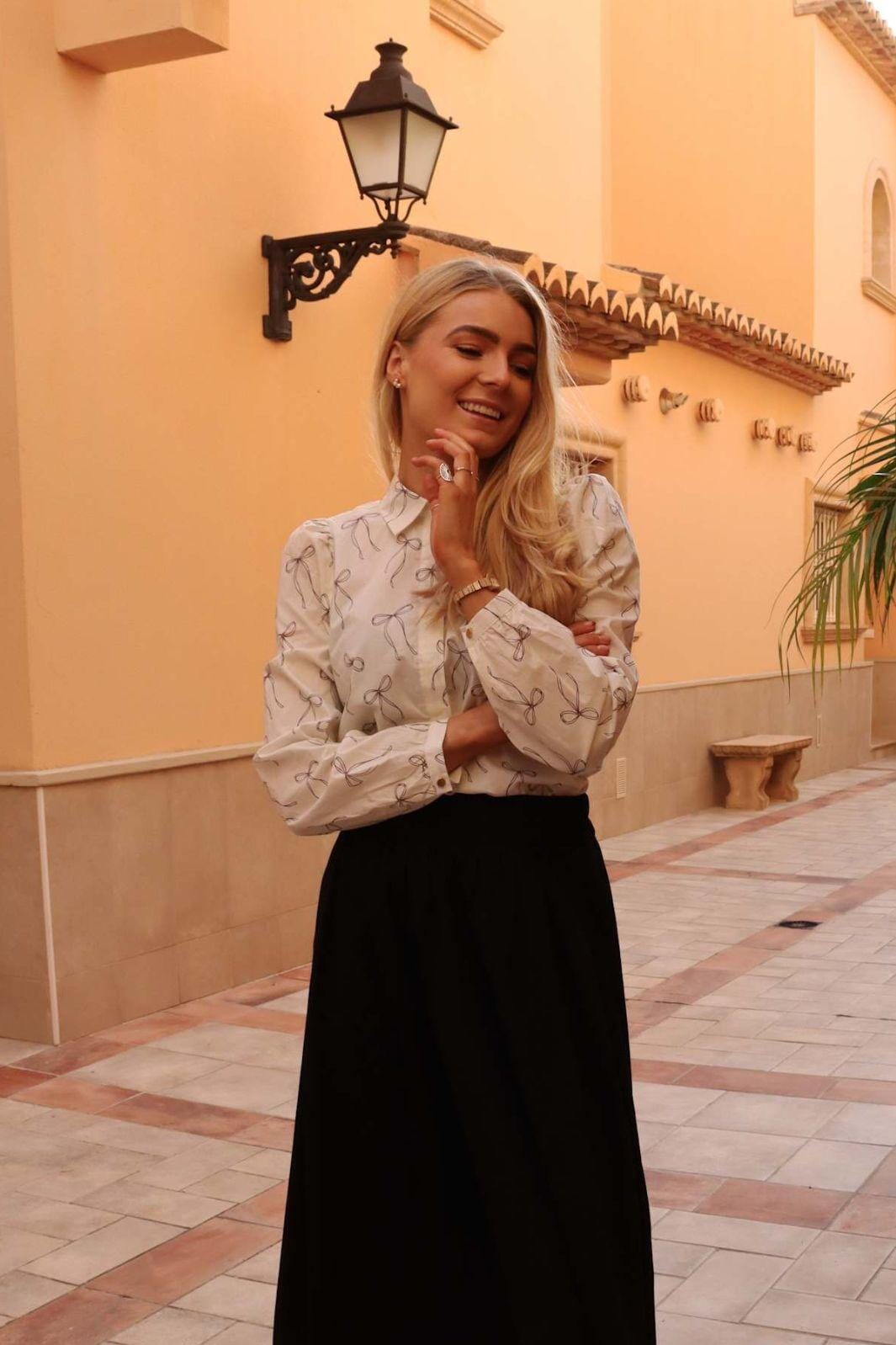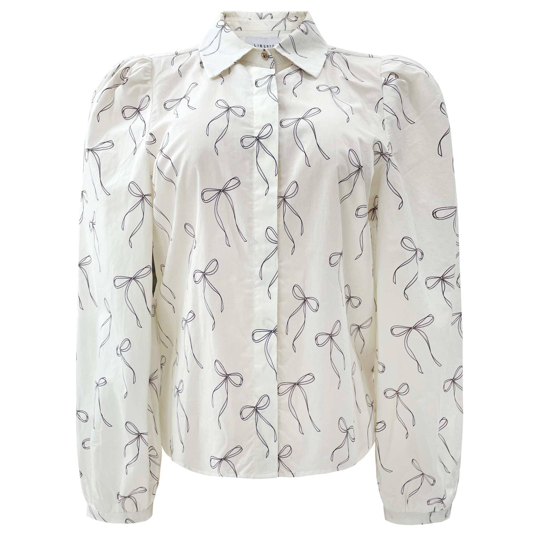 Kremowa bluzka marki Liberte z wzorem czarnych kokardek. Bluzka ma długie rękawy i klasyczny kołnierzyk koszulowy.