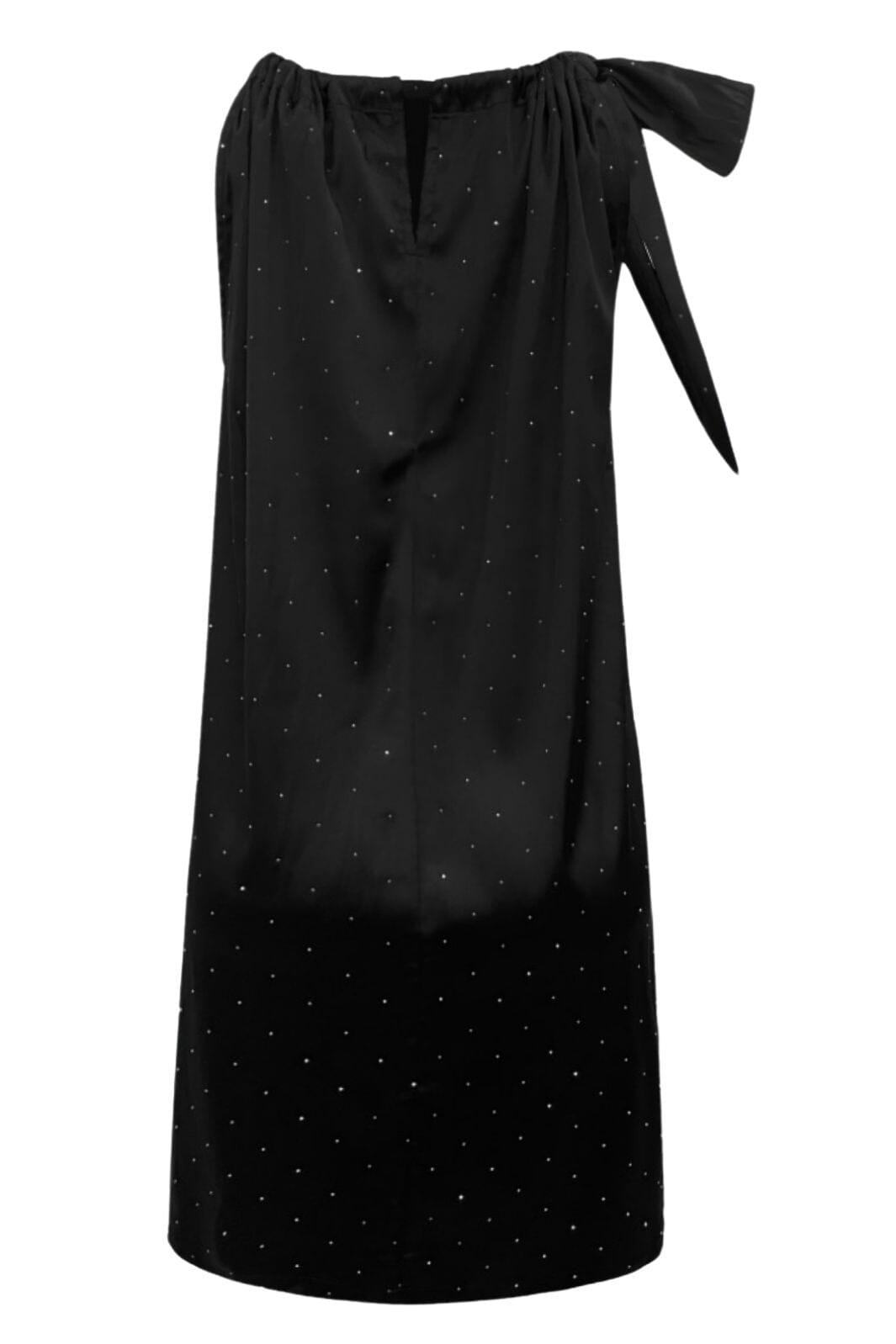 Czarna sukienka na przyjęcie z dekoltem halterneck i kokardą na ramieniu. Sukienka ma błyszczące, diamentopodobne detale na całej tkaninie i długość do uda.