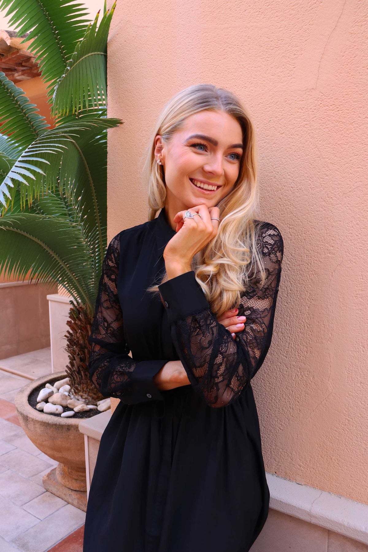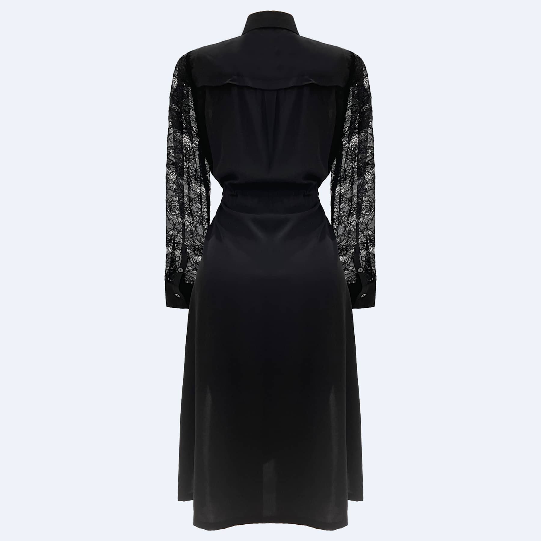 Czarna długa koszula marki Liberte z koronkowymi rękawami i wiązanym paskiem w talii. Koszula sprawdzi się zarówno na co dzień, jak i na uroczyste okazje.