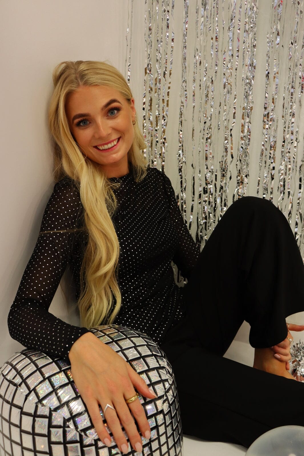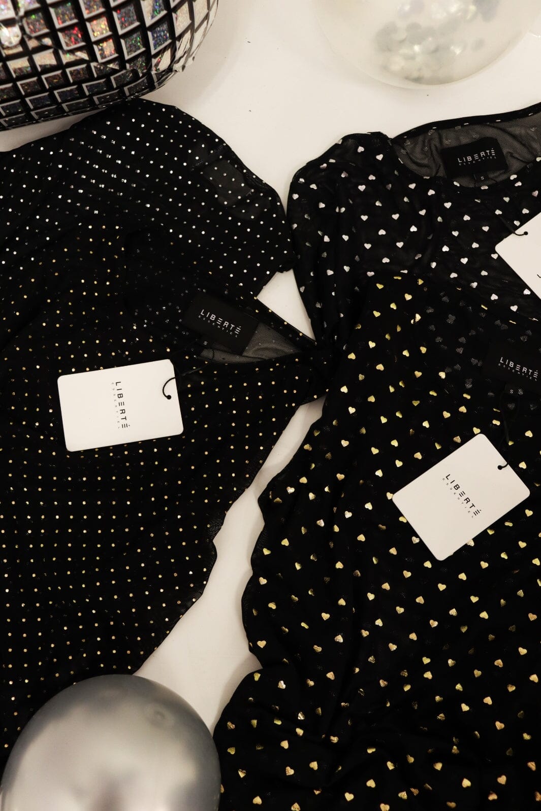 Czarna bluzka z siateczki od Liberte z srebrnymi kropkami na całej bluzce. Długie rękawy i okrągły dekolt nadają bluzce klasyczny krój.