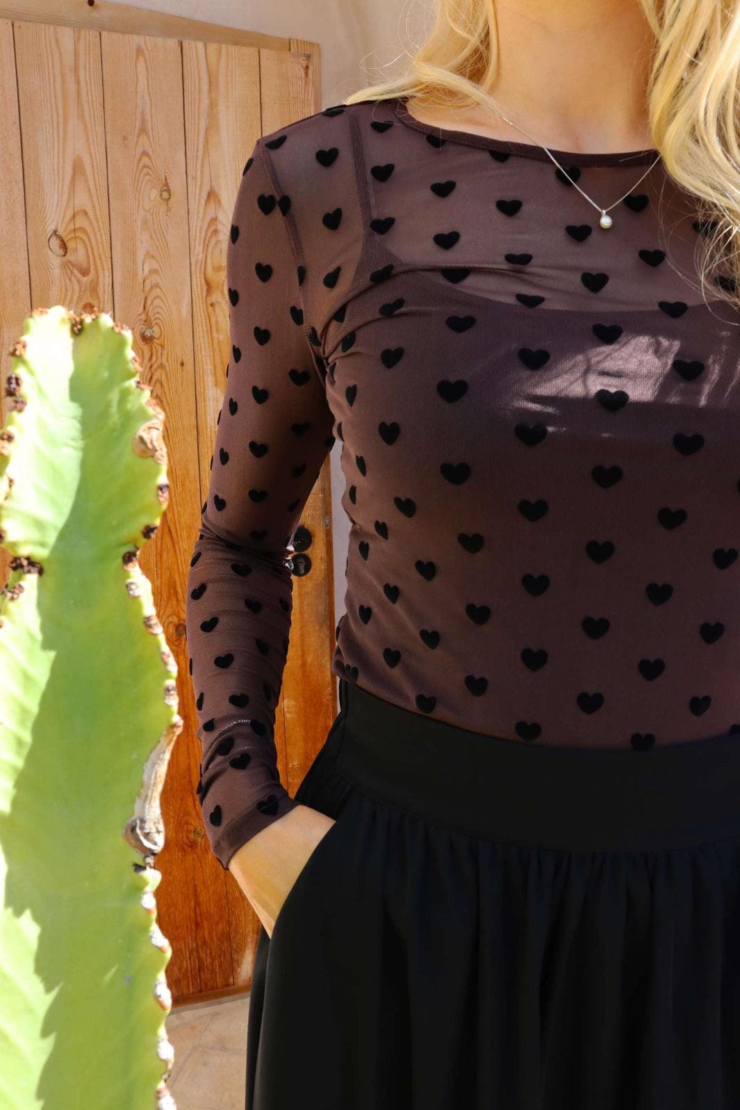 Bluzka mesh od Liberte w ciemnobrązowym kolorze z dużymi czarnymi kropkami. T-shirt ma długie rękawy i okrągły dekolt.