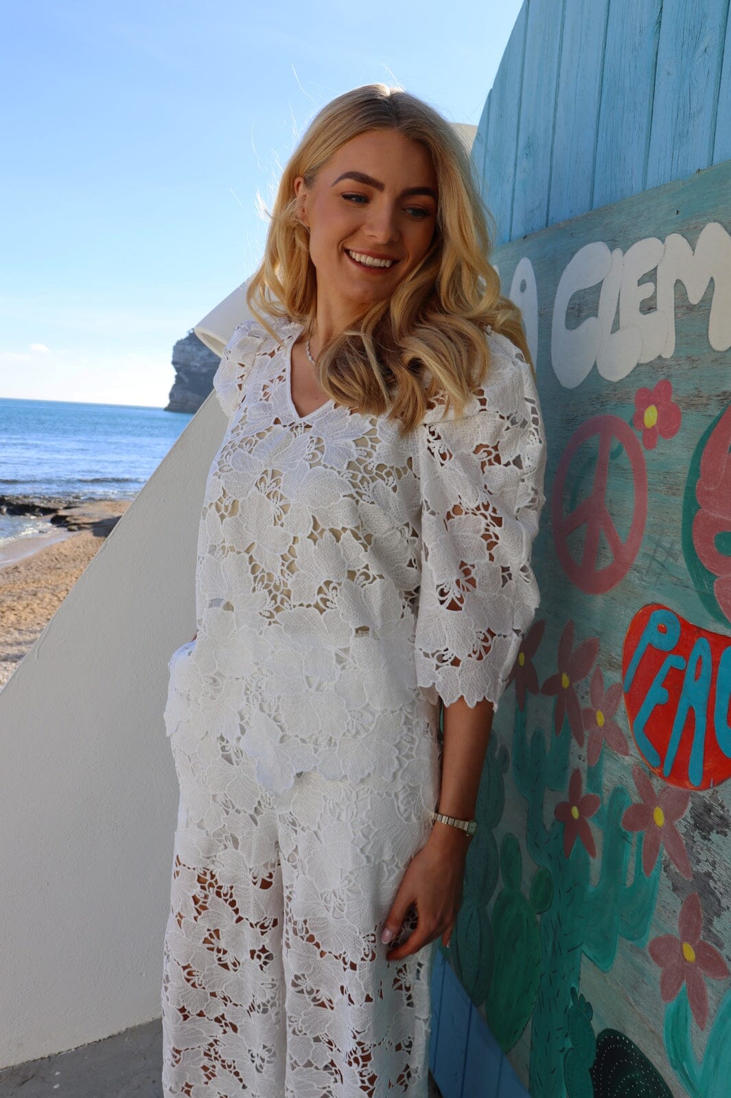 Białe spodnie marki Liberte z 100% poliestru. Spodnie mają haftowaną koronkę z kwiatowym wzorem i luźny krój.