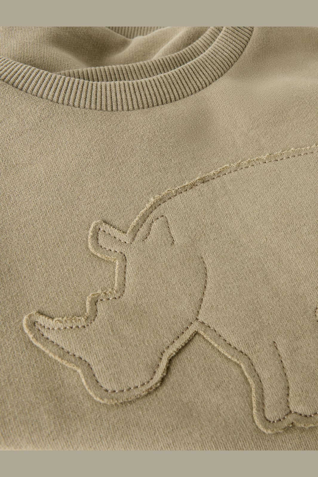 Bluza dresowa Lil' Atelier Mini w kolorze oliwkowym z haftowanym motywem nosorożca z przodu. Bluza ma prążkowane ściągacze i okrągły dekolt wykończony ściągaczem.