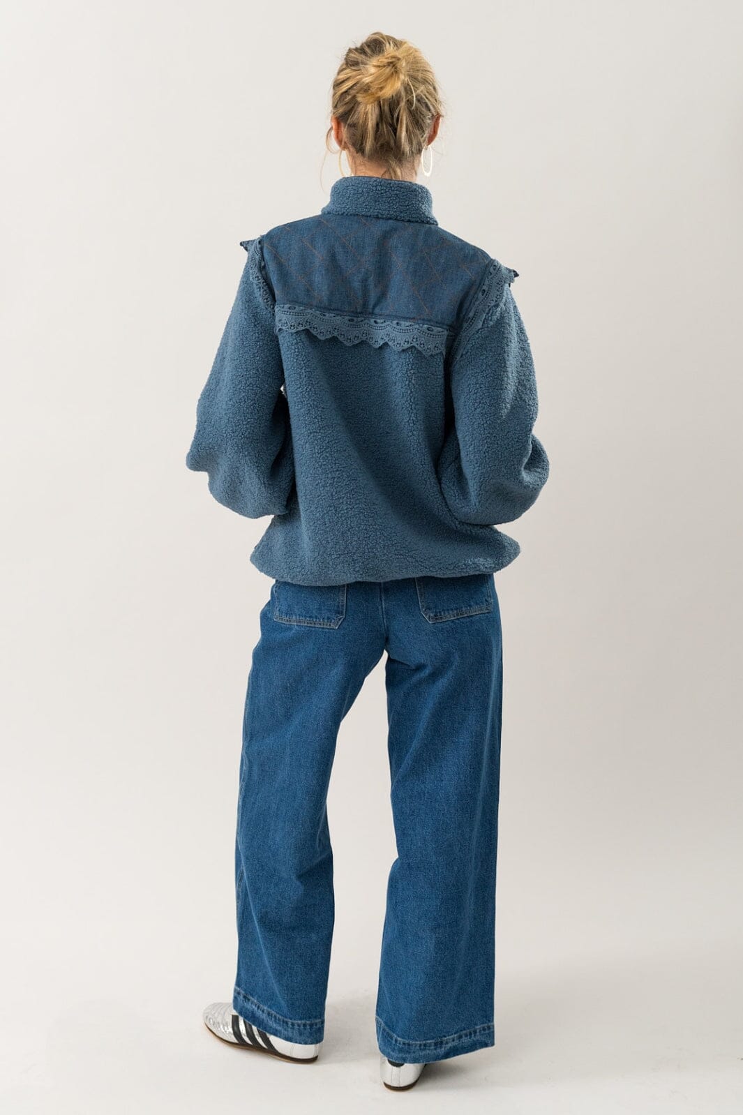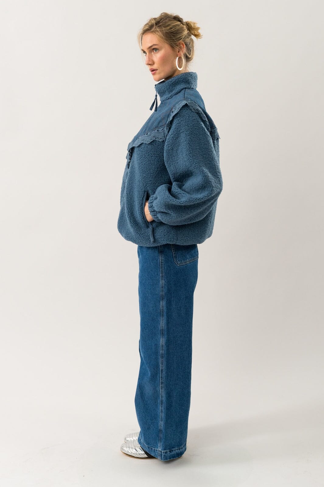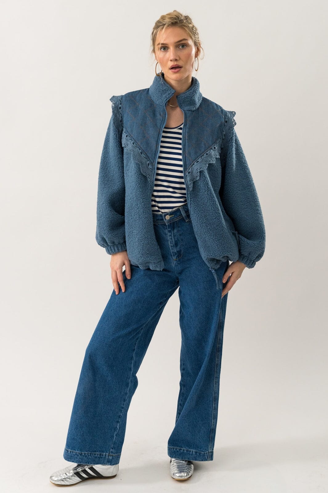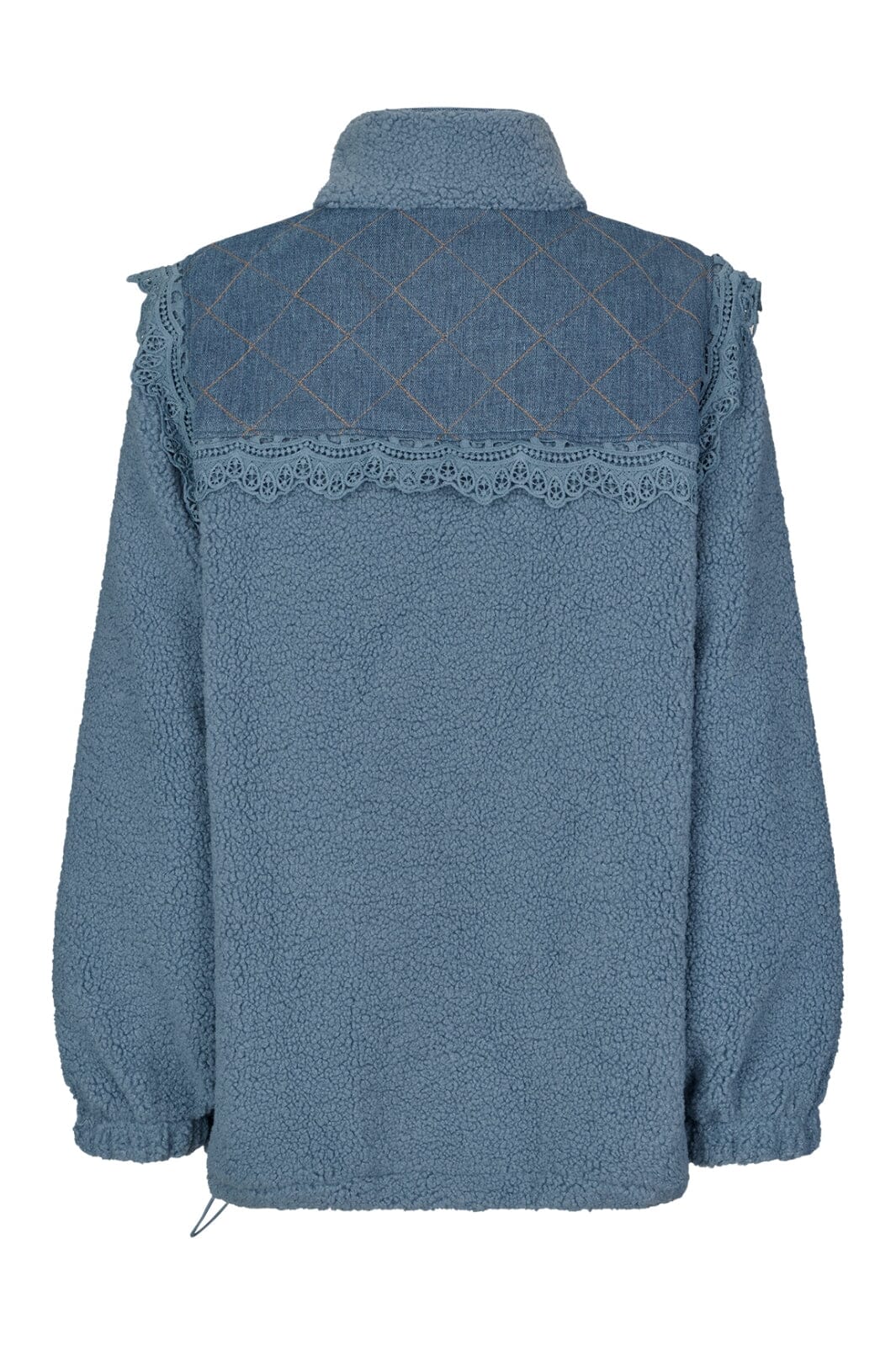 Kurtka od Lollys Laundry w przydymionym niebieskim kolorze. Ma wysoki kołnierz z zamkiem błyskawicznym i długie rękawy. Koronkowy brzeg z przodu nadaje kurtce szczególny charakter.
