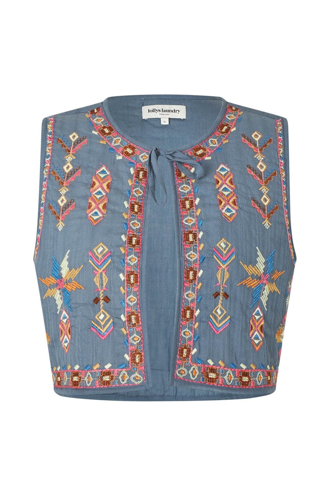 Kurczakowa niebieska kamizelka od Lollys Laundry z kolorowym haftem. Kamizelka ma okrągły dekolt z wiązaniem i jest wykonana z bawełny z detalicznymi wzorami wzdłuż krawędzi.