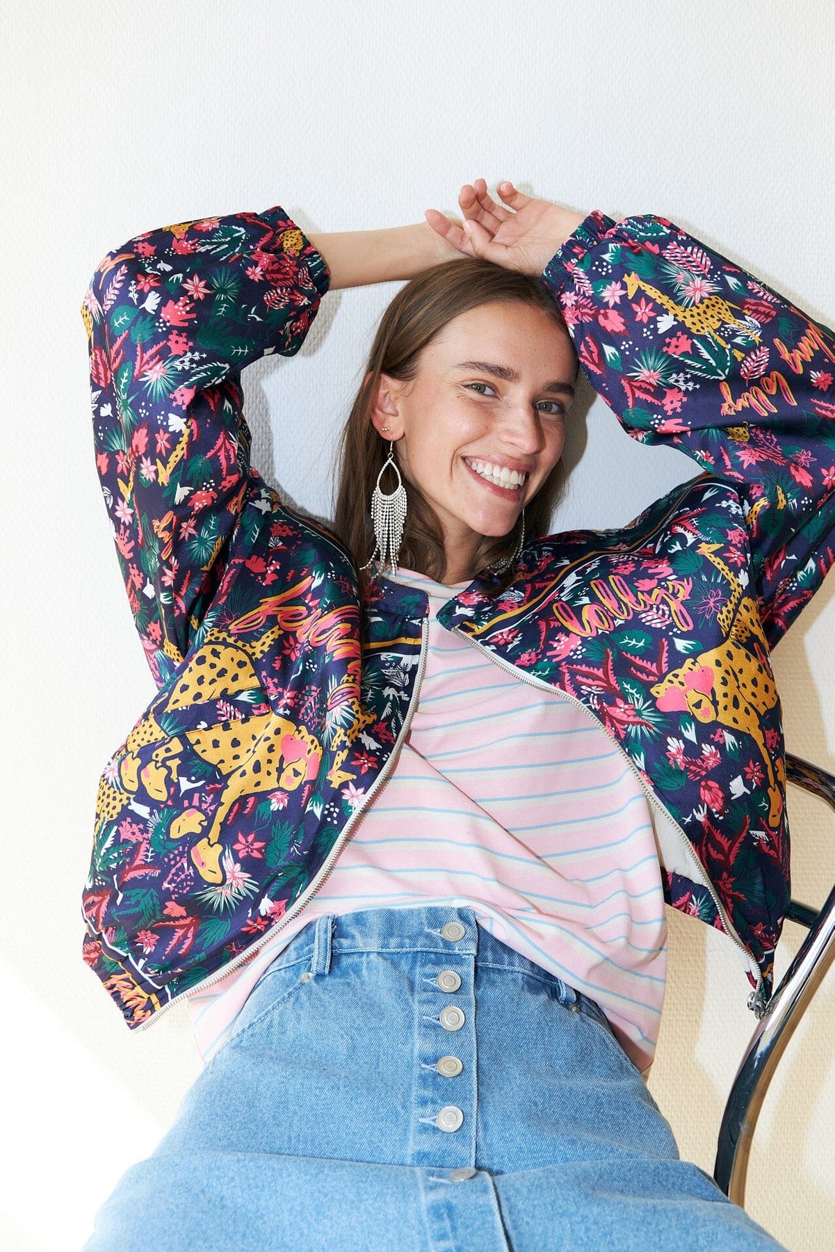 Kurtka od Lollys Laundry z kolorowym nadrukiem w pantery i kwiaty. Krótki model z zamkiem błyskawicznym z przodu i elastycznymi mankietami przy rękawach.