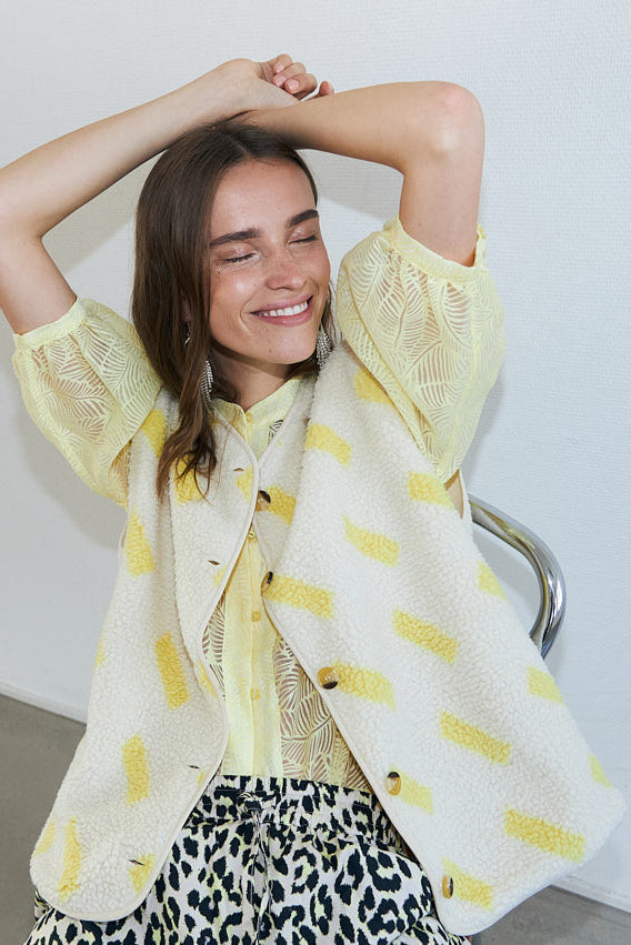 Biała koszula od Lollys Laundry z haftowanymi wzorami w brązie, fioletowym i żółtym. Krótki rękaw ma klasyczny kołnierzyk i żółte guziki z przodu.