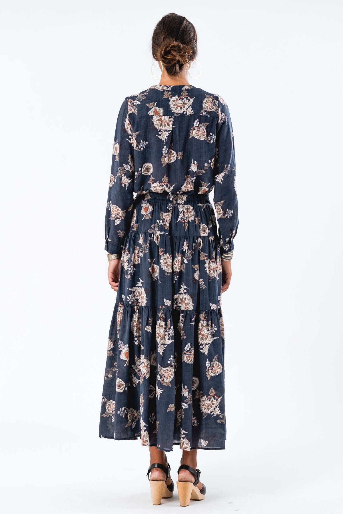 Granatowa maxi spódnica od Lollys Laundry z kwiatowym wzorem. Warstwowa spódnica ma falbany i volany, które nadają ruchu materiałowi.