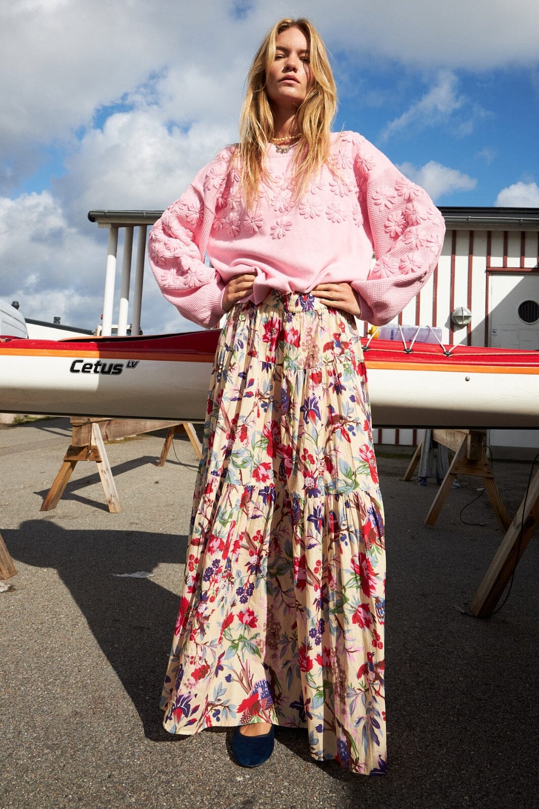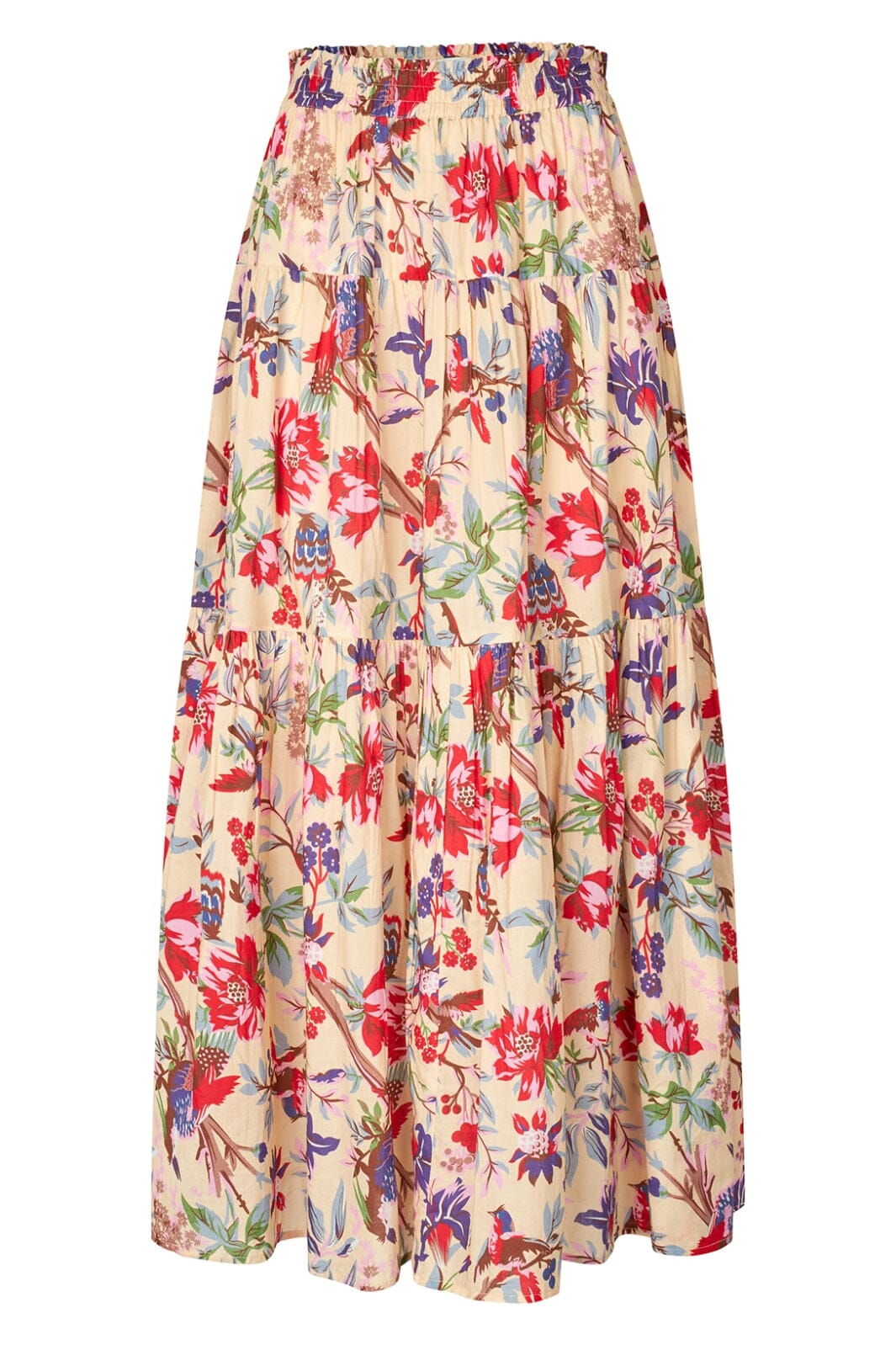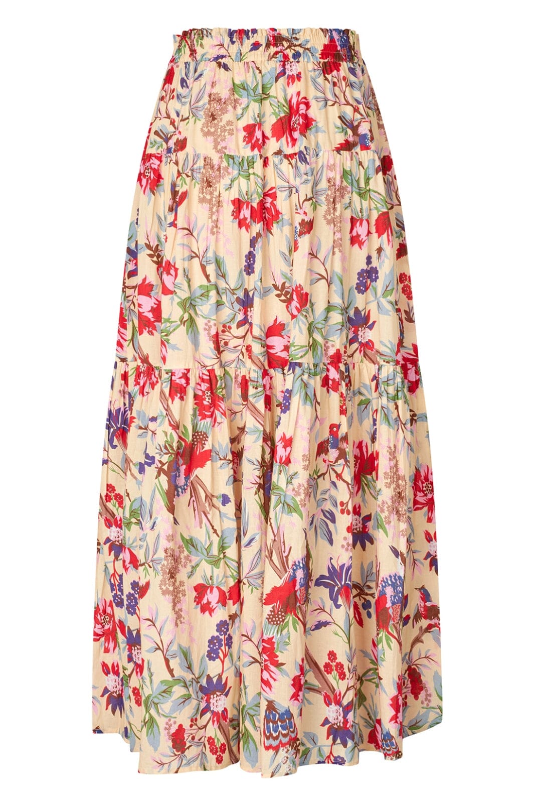 Długa spódnica od Lollys Laundry z kwiatowym nadrukiem w różowym, kremowym i wielu innych kolorach. Warstwowy design ma falbany i elastyczną talię, która zapewnia ruch w tkaninie.