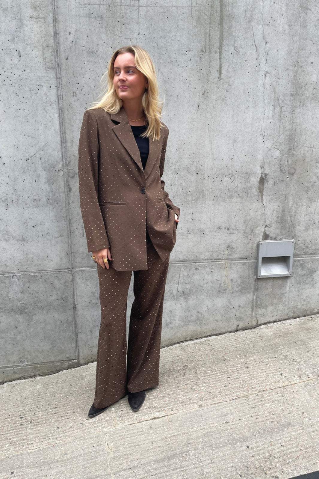 Marynarka od Love & Divine w brązowym kolorze z drobnymi detalami z dżetów. Żakiet ma klasyczny krój z klapami i pojedynczym zapięciem na guzik.