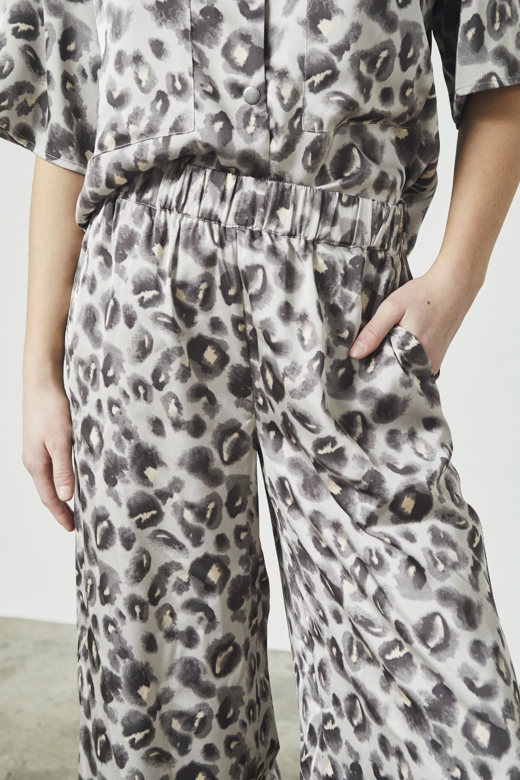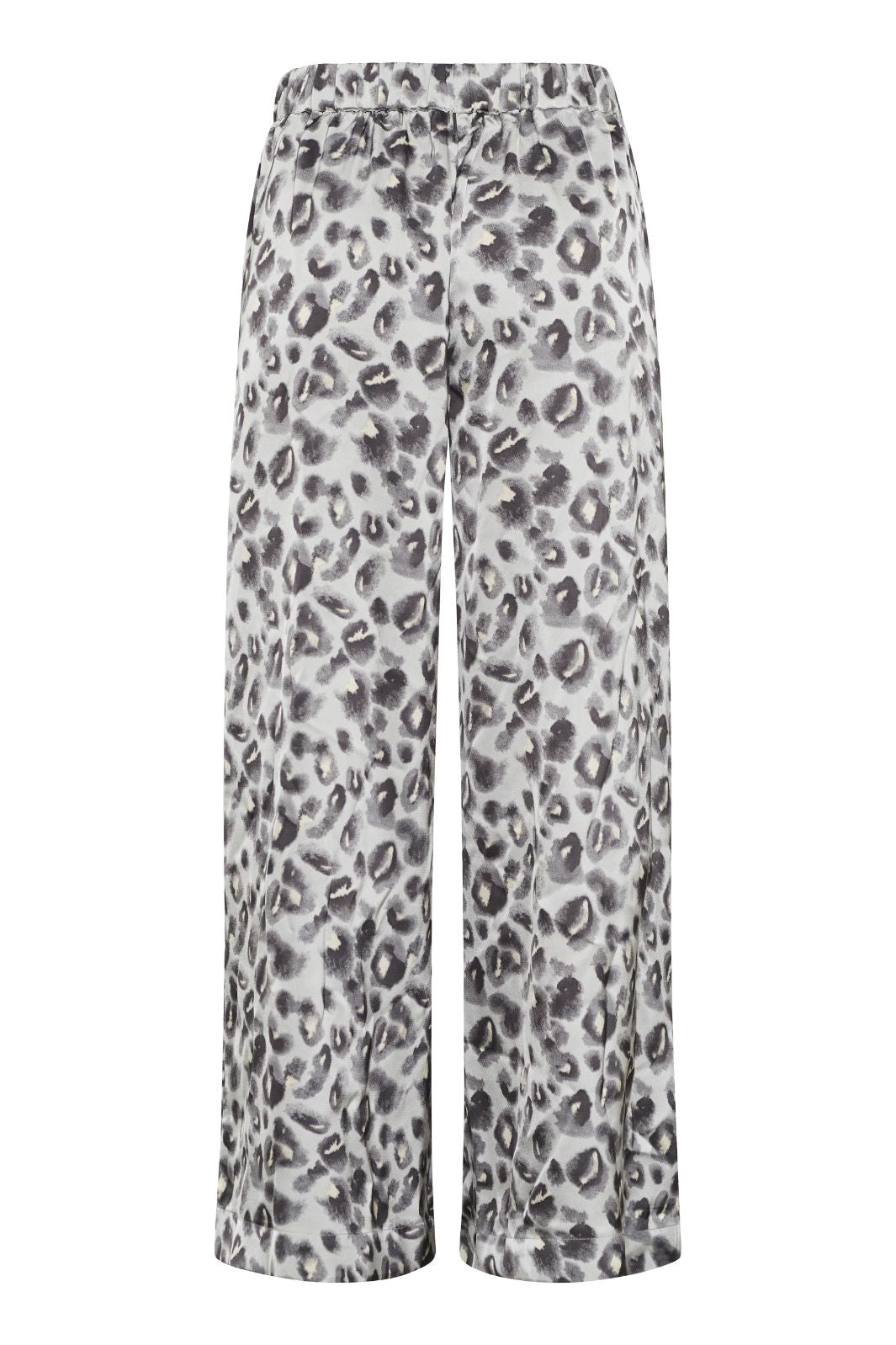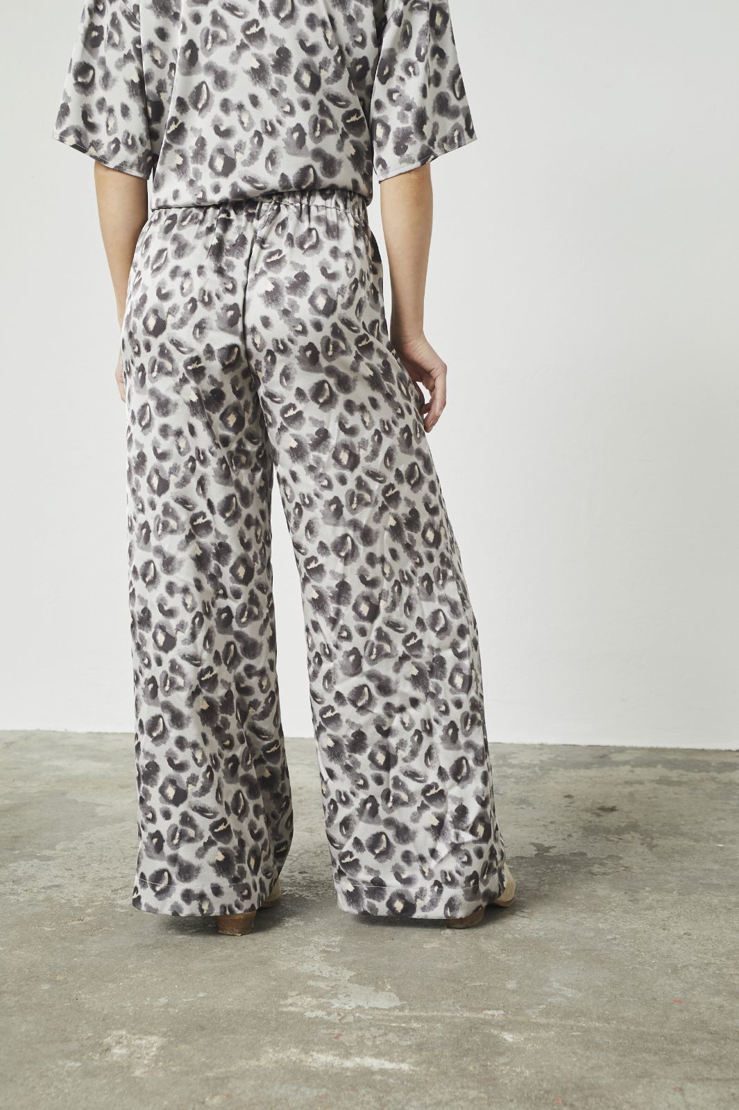 Spodnie od Love & Divine w szarym i beżowym wzorze w panterkę. Mają szeroką nogawkę i elastyczny pas, który zapewnia dobrą swobodę ruchów.