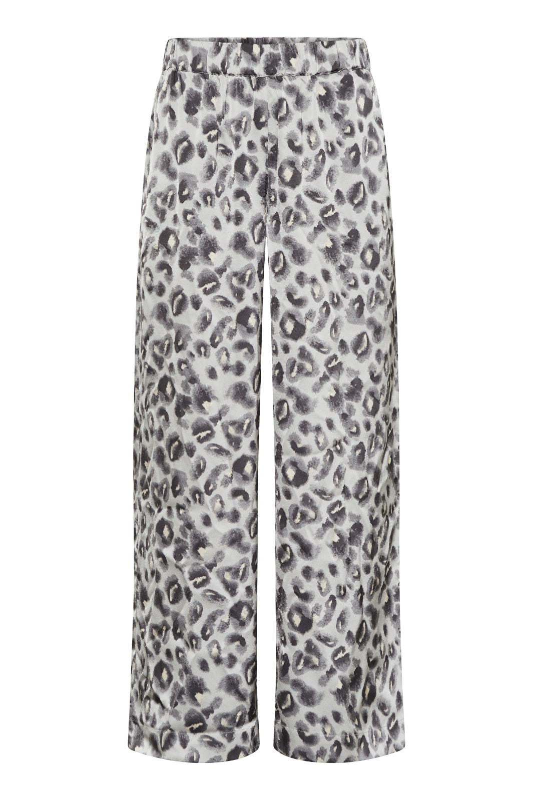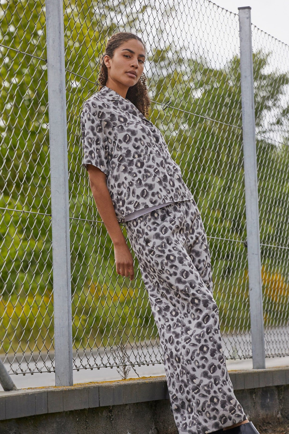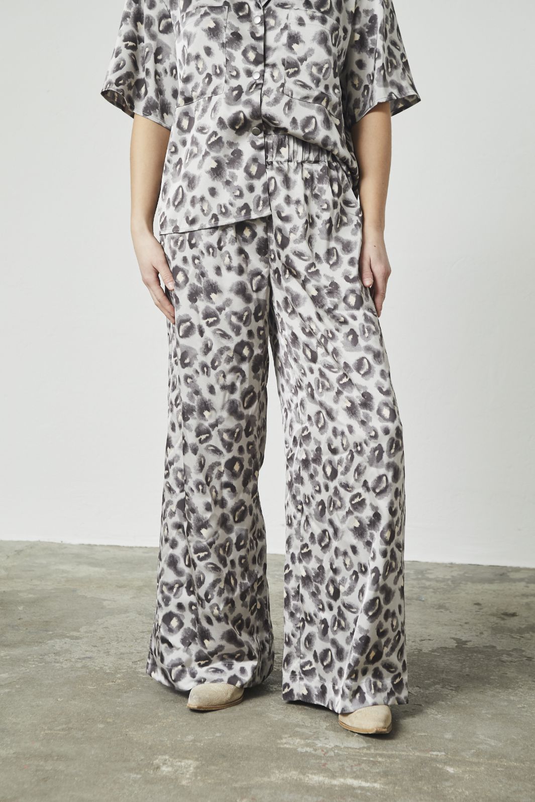 Spodnie od Love & Divine w szarym i beżowym wzorze w panterkę. Mają szeroką nogawkę i elastyczny pas, który zapewnia dobrą swobodę ruchów.