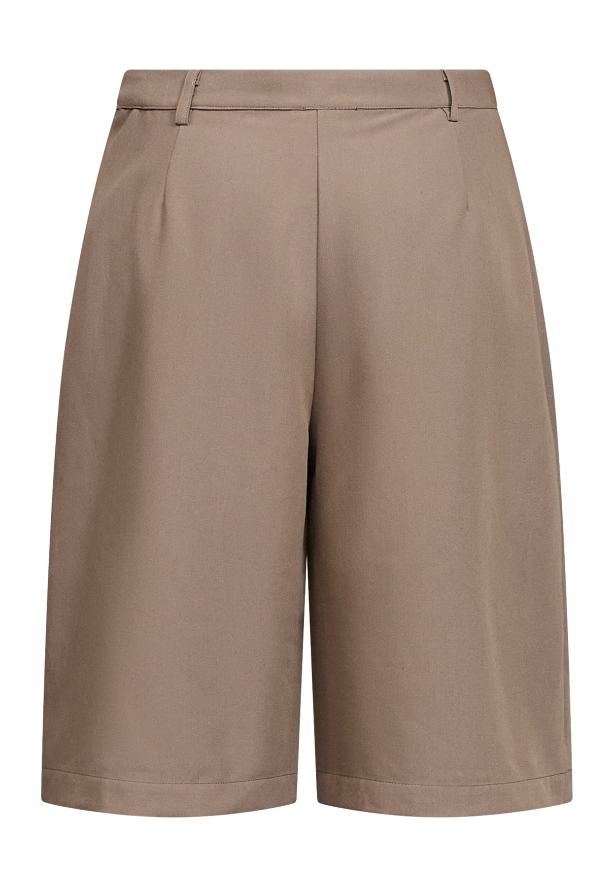 Piaskowe bermudy od Love & Divine z wysokim stanem i luźnym krojem. Szorty sięgają do okolic kolan i mają szlufki na pasek oraz kieszenie.