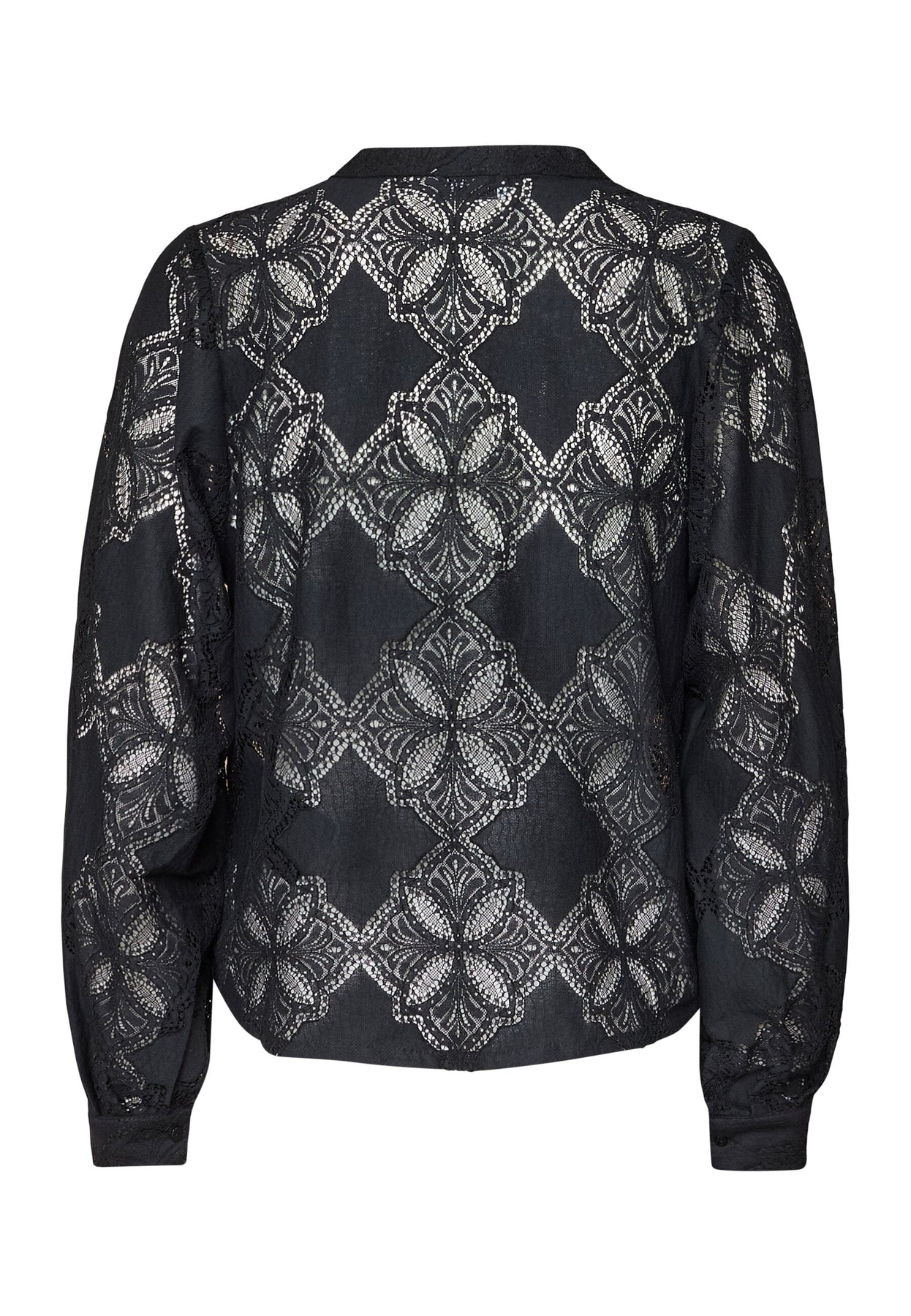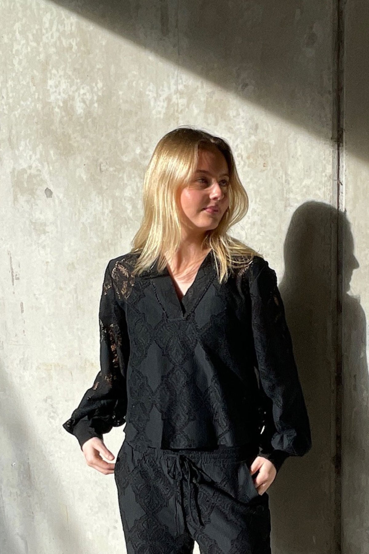 Czarna bluzka marki Love & Divine z koronkowym wzorem na całej powierzchni. Bluzka ma głęboki dekolt w kształcie litery V oraz długie, lekko bufiaste rękawy z mankietami.