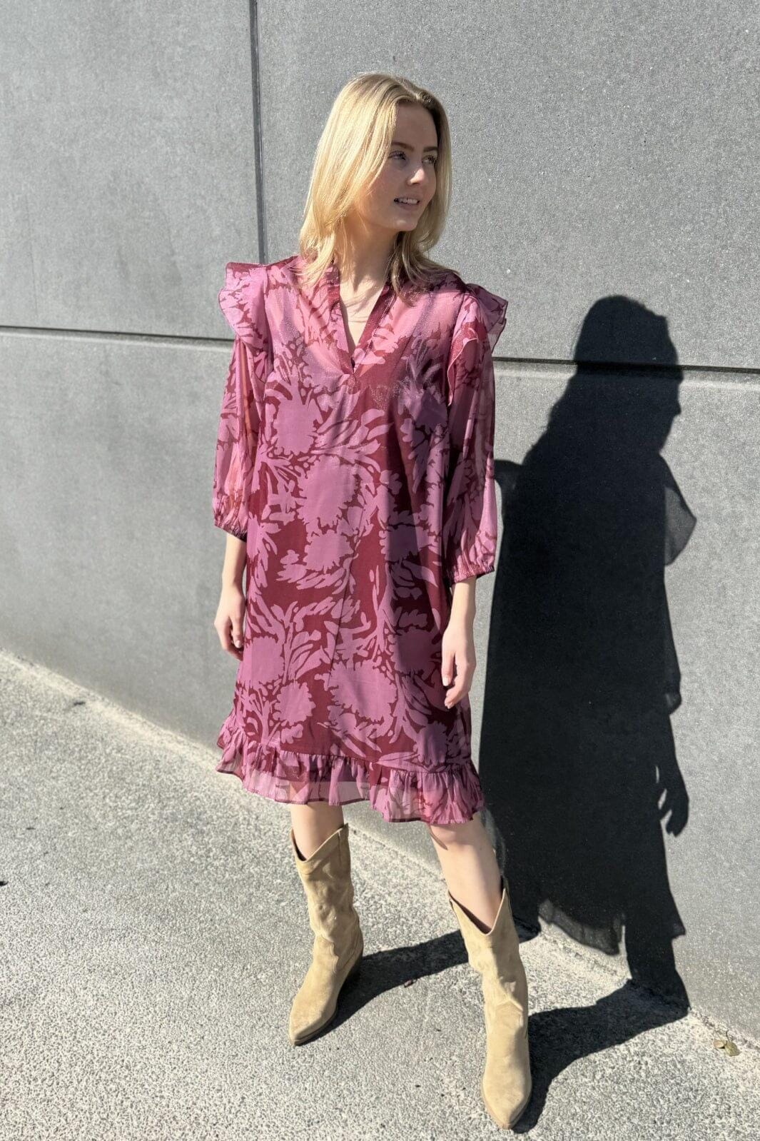 Sukienka od Love & Divine z kwiatowym wzorem w odcieniach blush i burgunda. Ma dekolt w kształcie V, rękawy 3/4 oraz marszczone detale przy rękawach i u dołu.