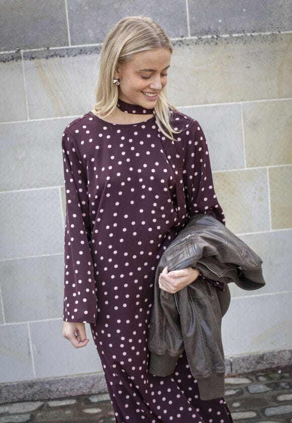 Długa sukienka z długim rękawem od Love & Divine w kolorze bordowym z jasnymi kropkami. Długa sukienka ma okrągły dekolt i luźny krój z rozcięciem po bokach.