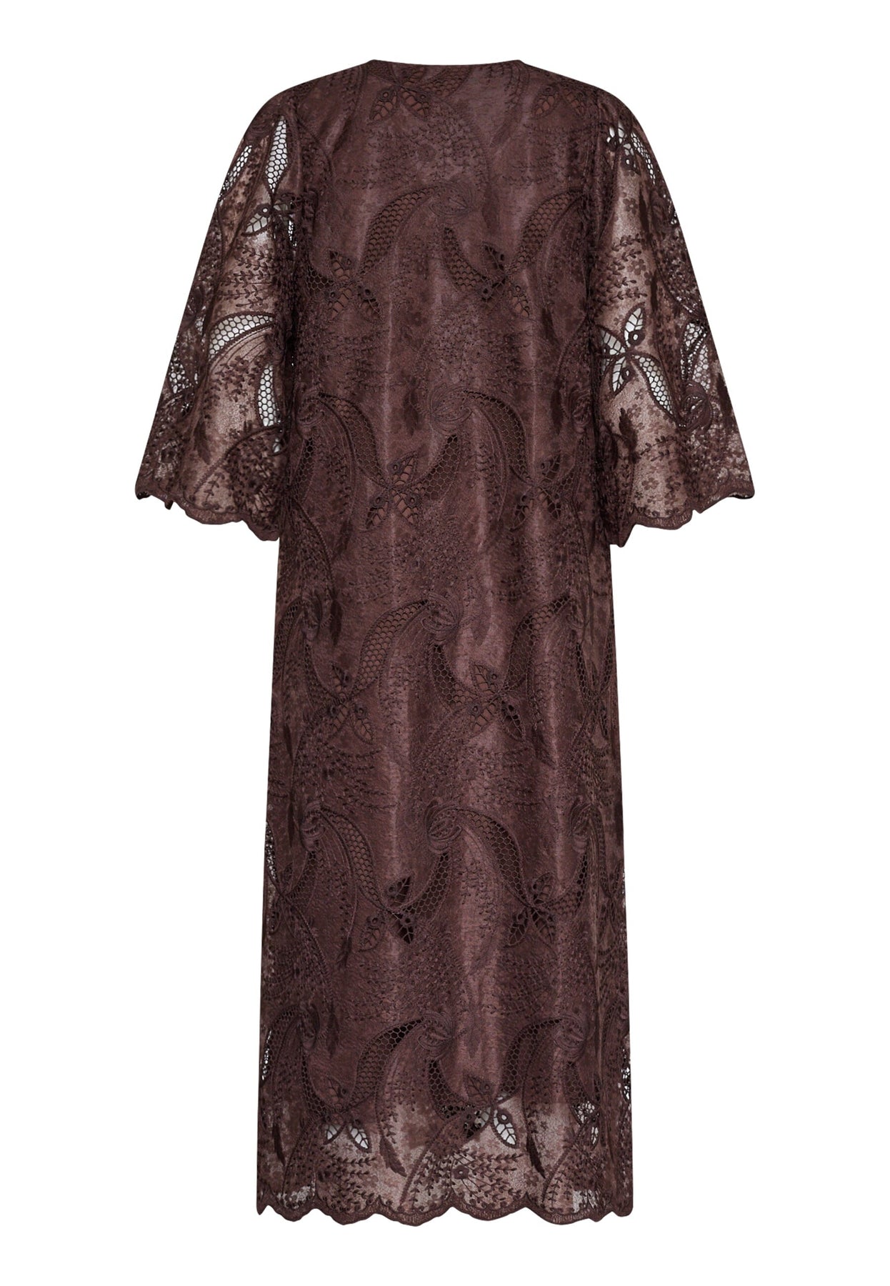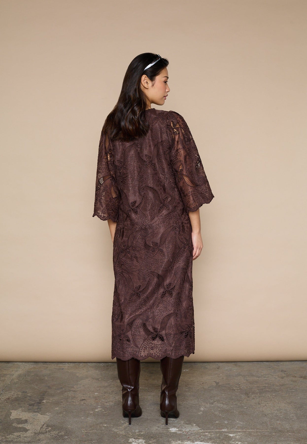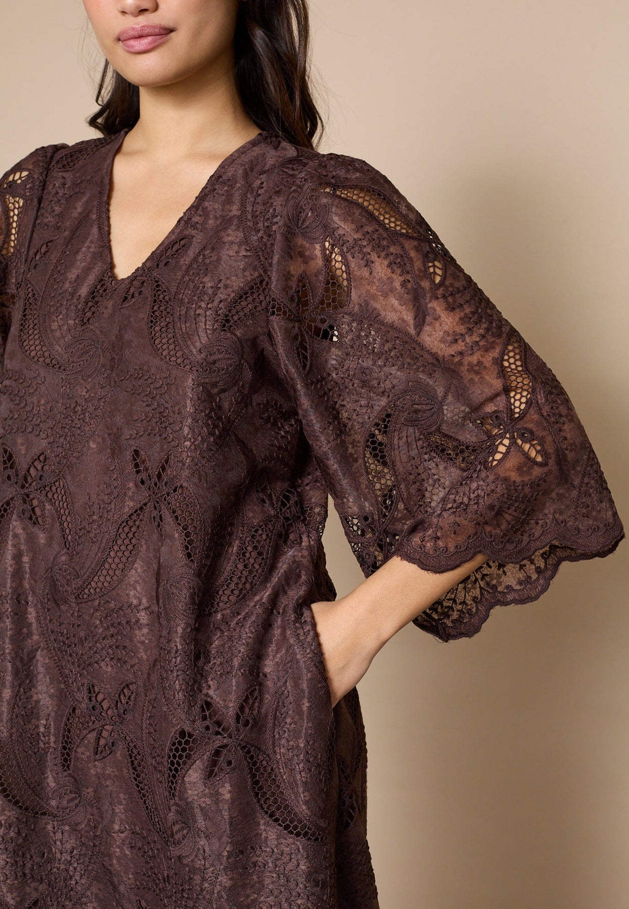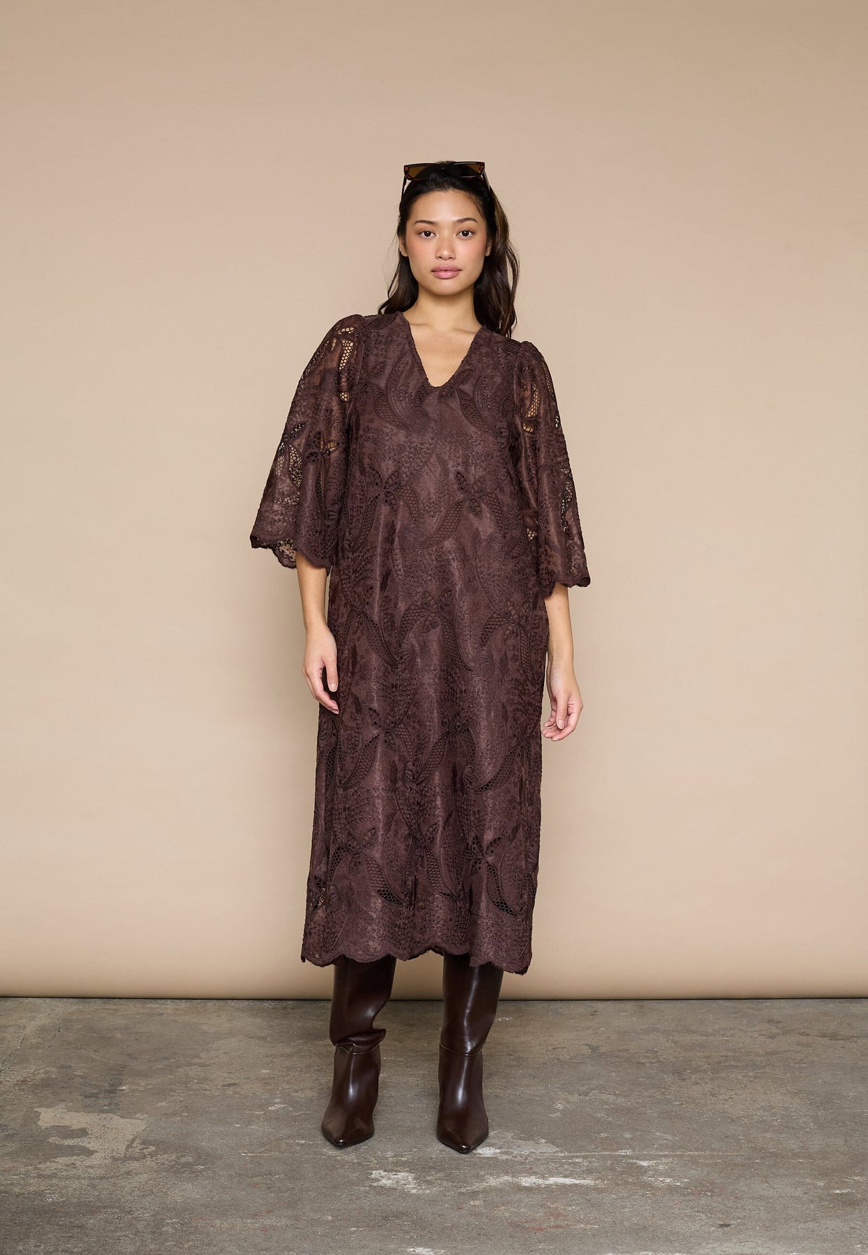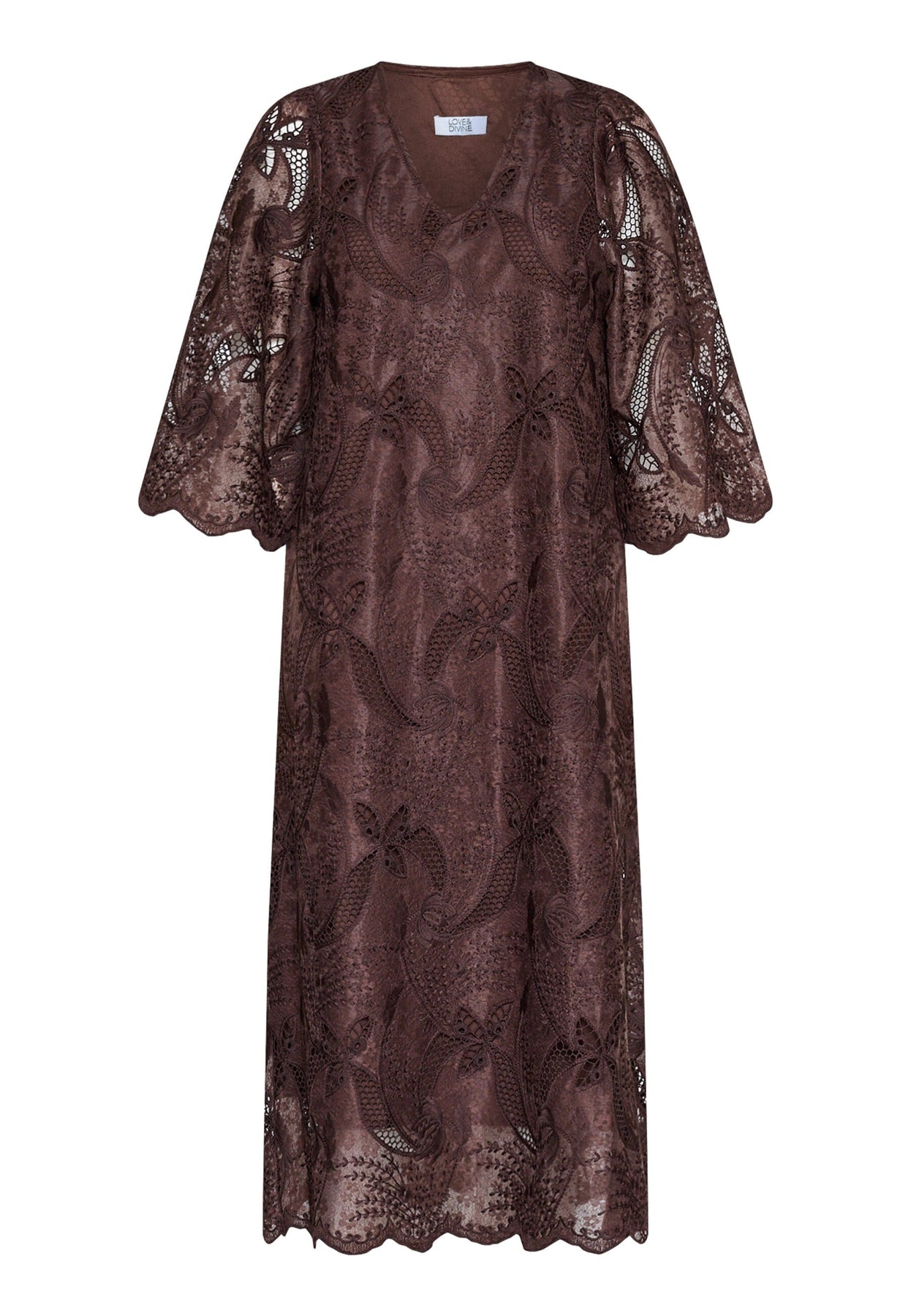 Brązowa sukienka Love & Divine z haftem i koronką. Sukienka ma rękawy o długości 3/4, dekolt w kształcie litery V oraz kwiatowy wzór z motywem paisley.
