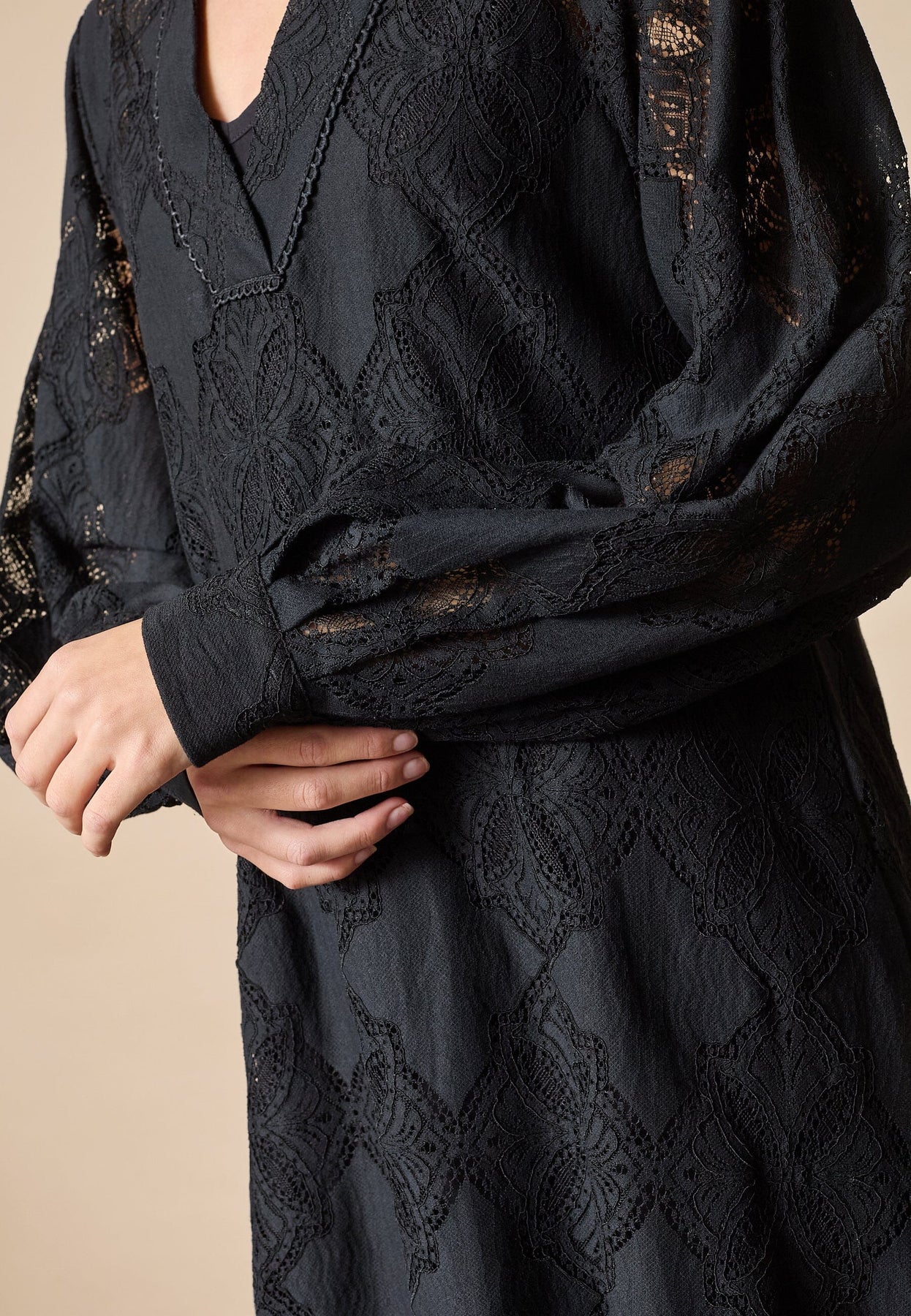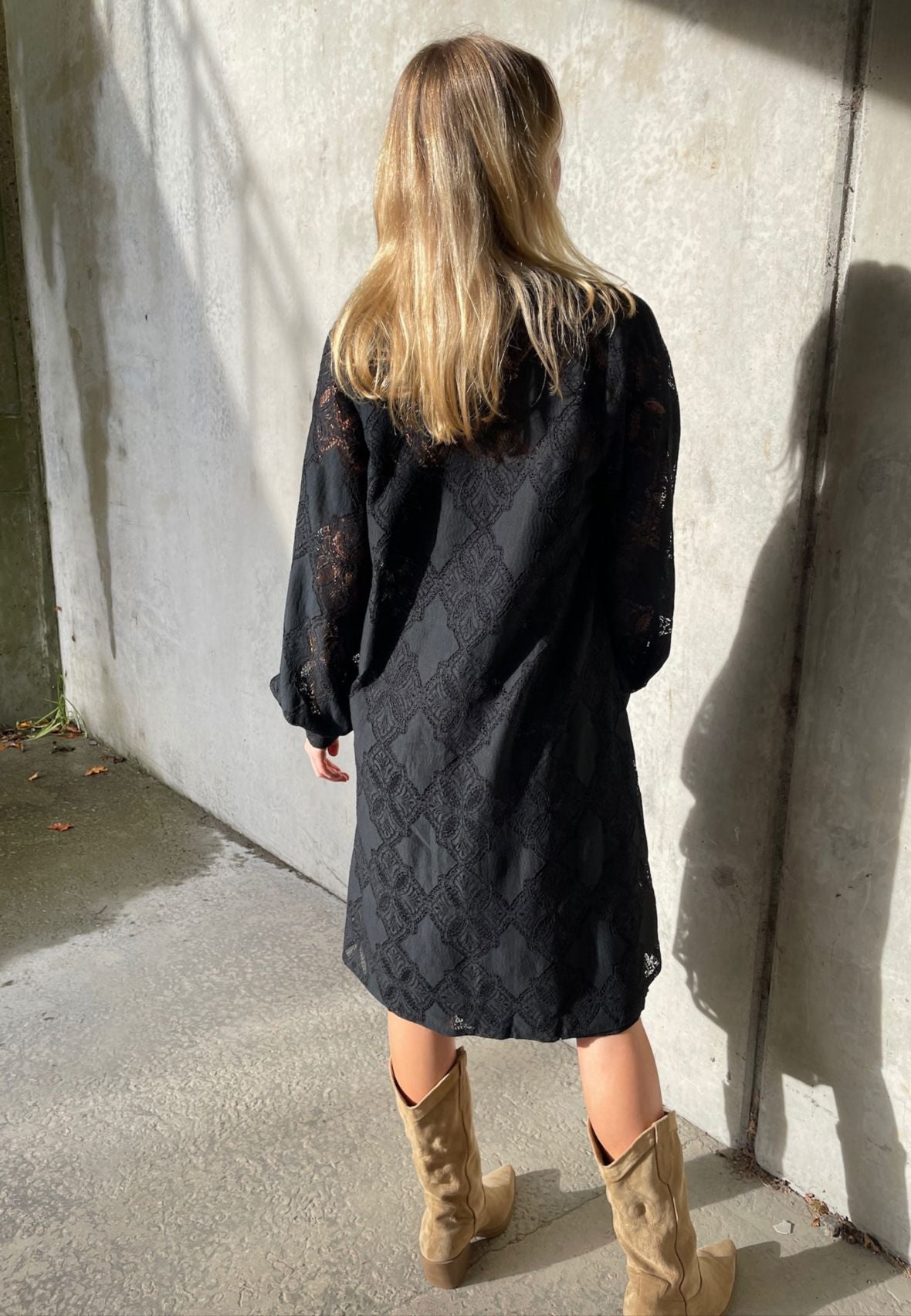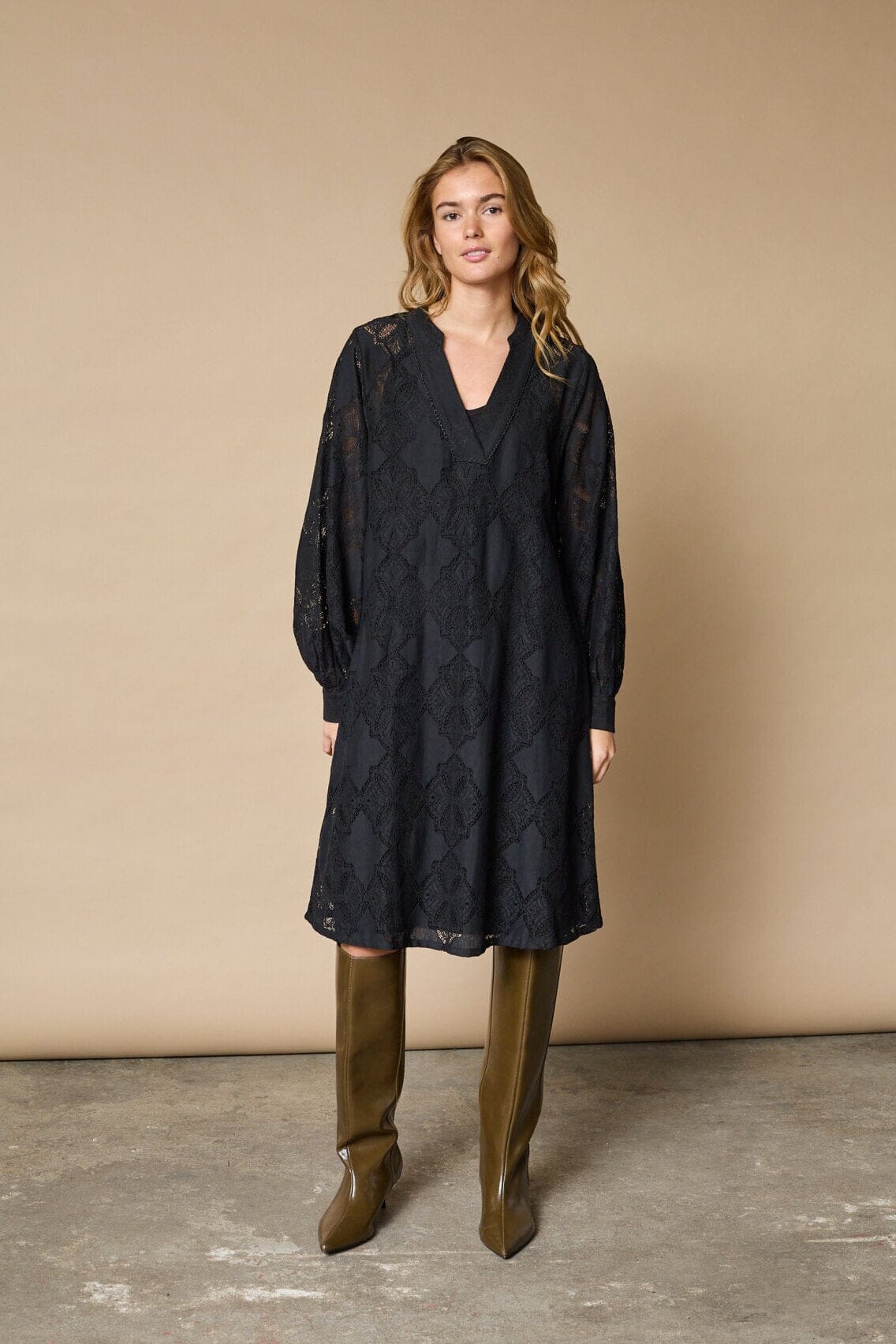 Czarna sukienka marki Love & Divine z haftami i koronkowymi detalami w tkaninie. Sukienka ma długość do kolan i luźny krój, dzięki czemu sprawdzi się zarówno na co dzień, jak i na uroczyste oraz formalne okazje.