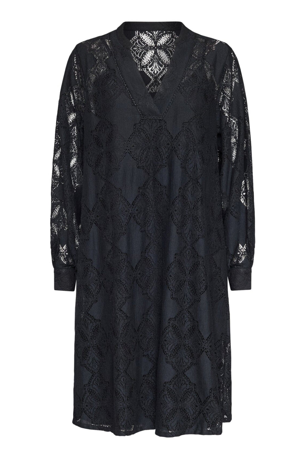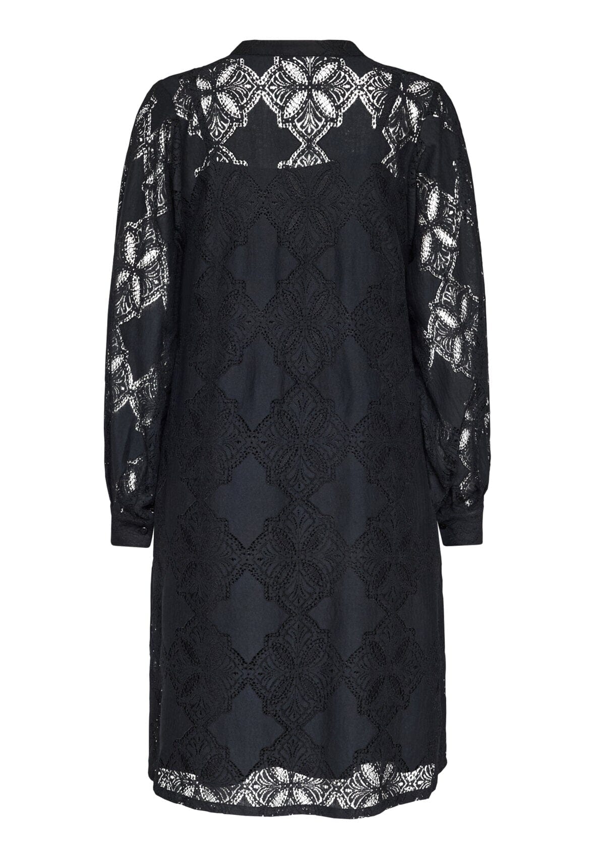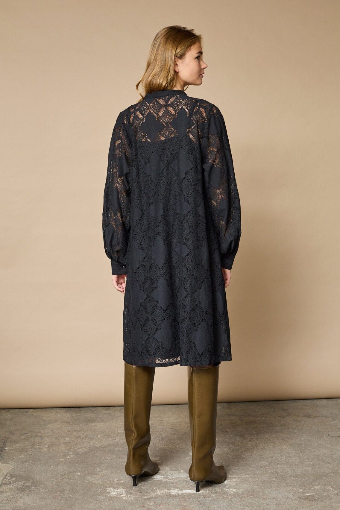 Czarna sukienka marki Love & Divine z haftami i koronkowymi detalami w tkaninie. Sukienka ma długość do kolan i luźny krój, dzięki czemu sprawdzi się zarówno na co dzień, jak i na uroczyste oraz formalne okazje.