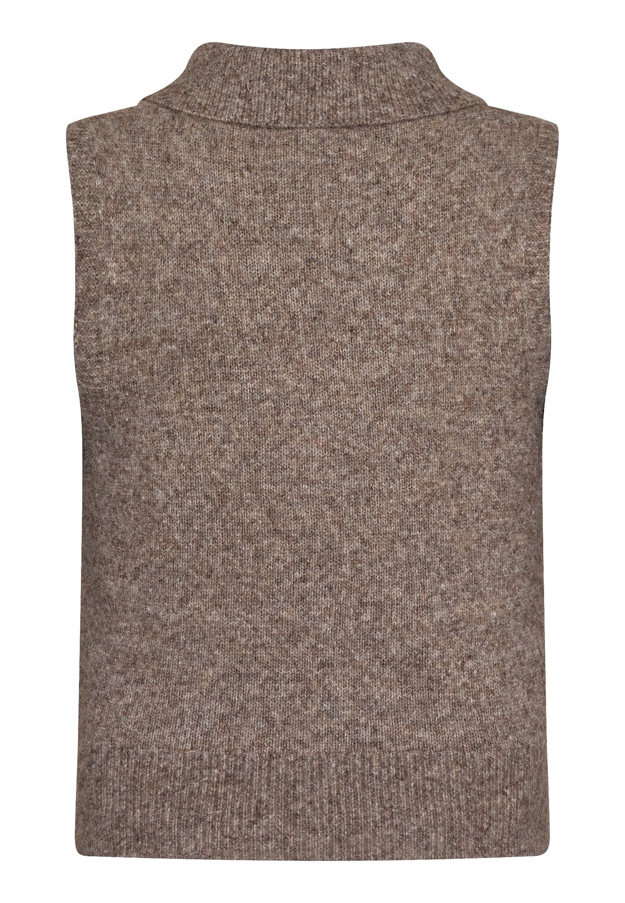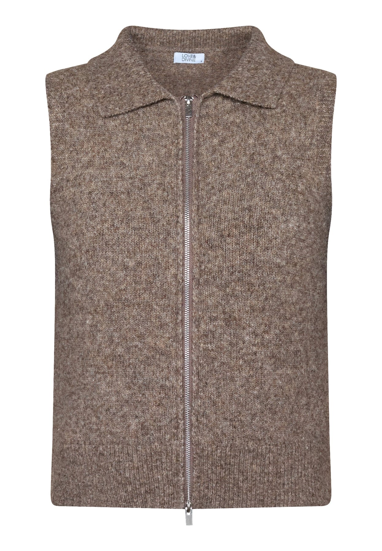 Bezrękawnik dzianinowy od Love & Divine w brązowym melanżowym kolorze. Kamizelka ma kołnierz polo oraz zamek błyskawiczny na całej długości z przodu.