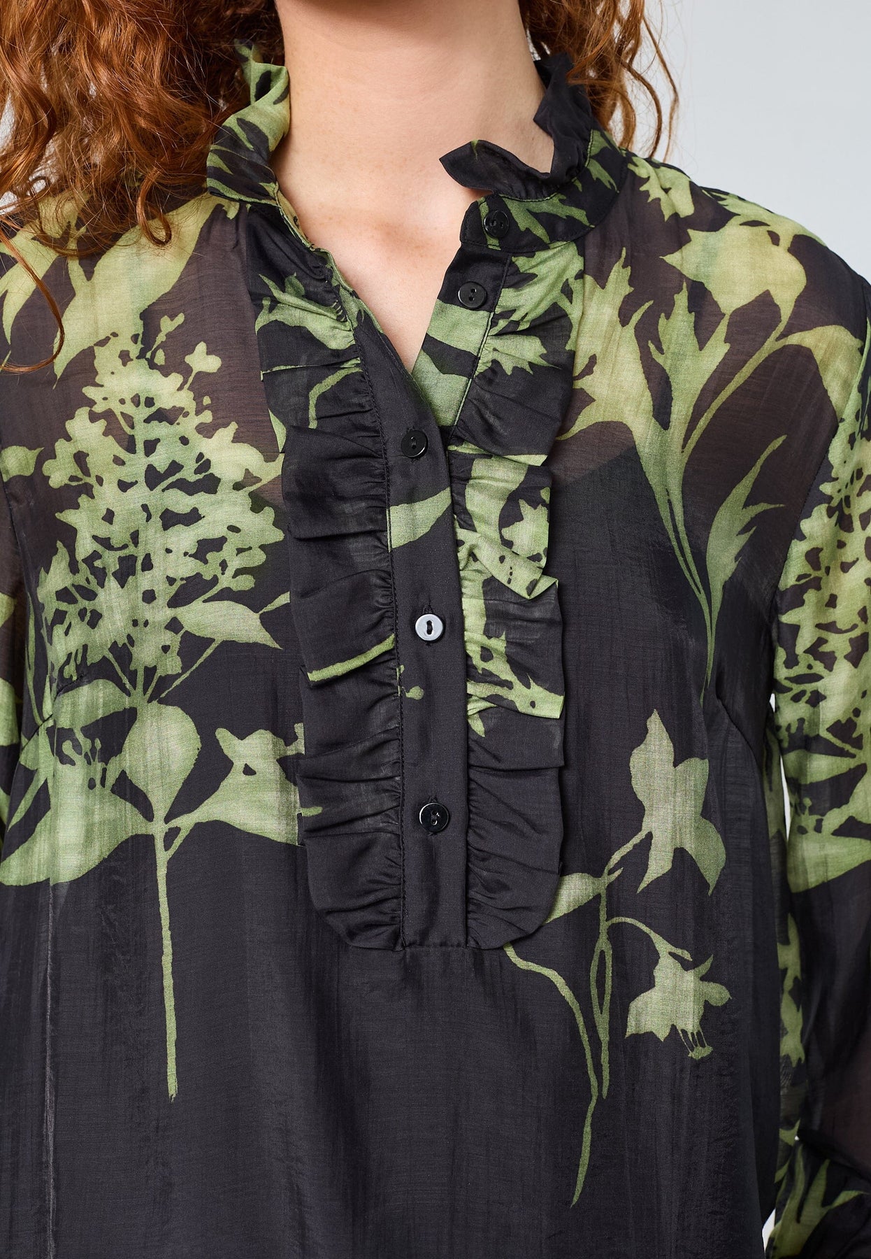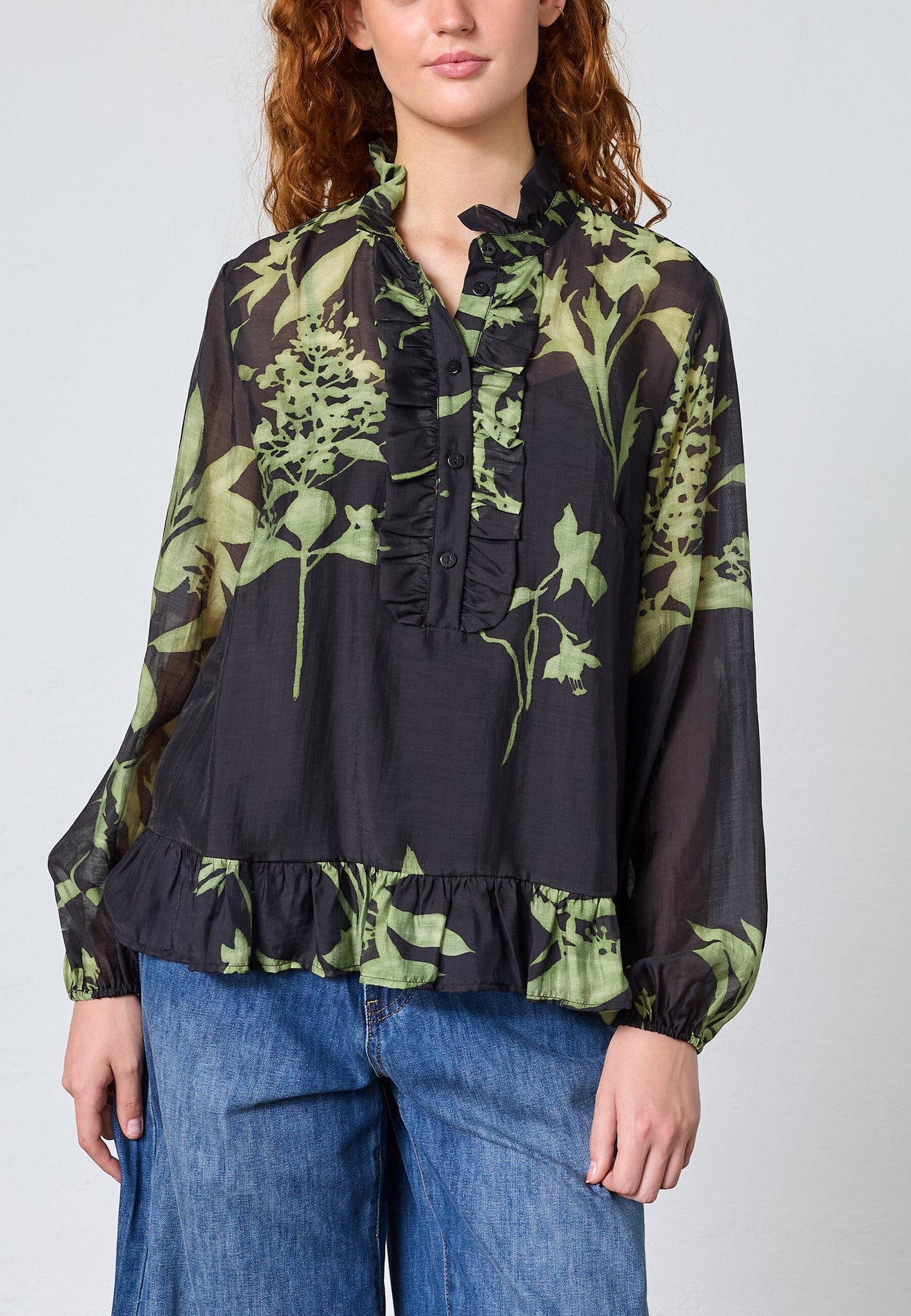 Bluzka marki Love & Divine z wysokim kołnierzem i zielonym kwiatowym nadrukiem na ciemnym tle. Bluzka ma falbanki przy dekolcie oraz długie, marszczone rękawy.
