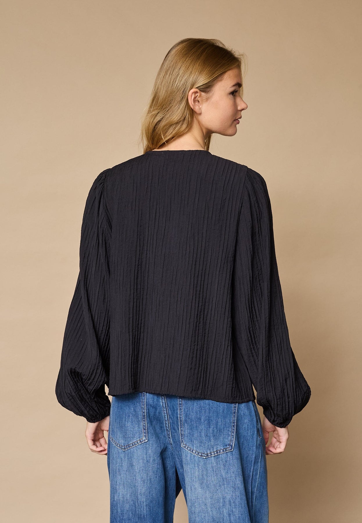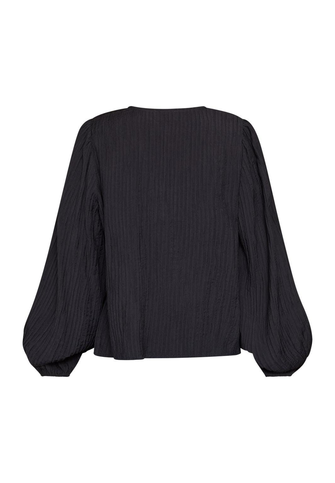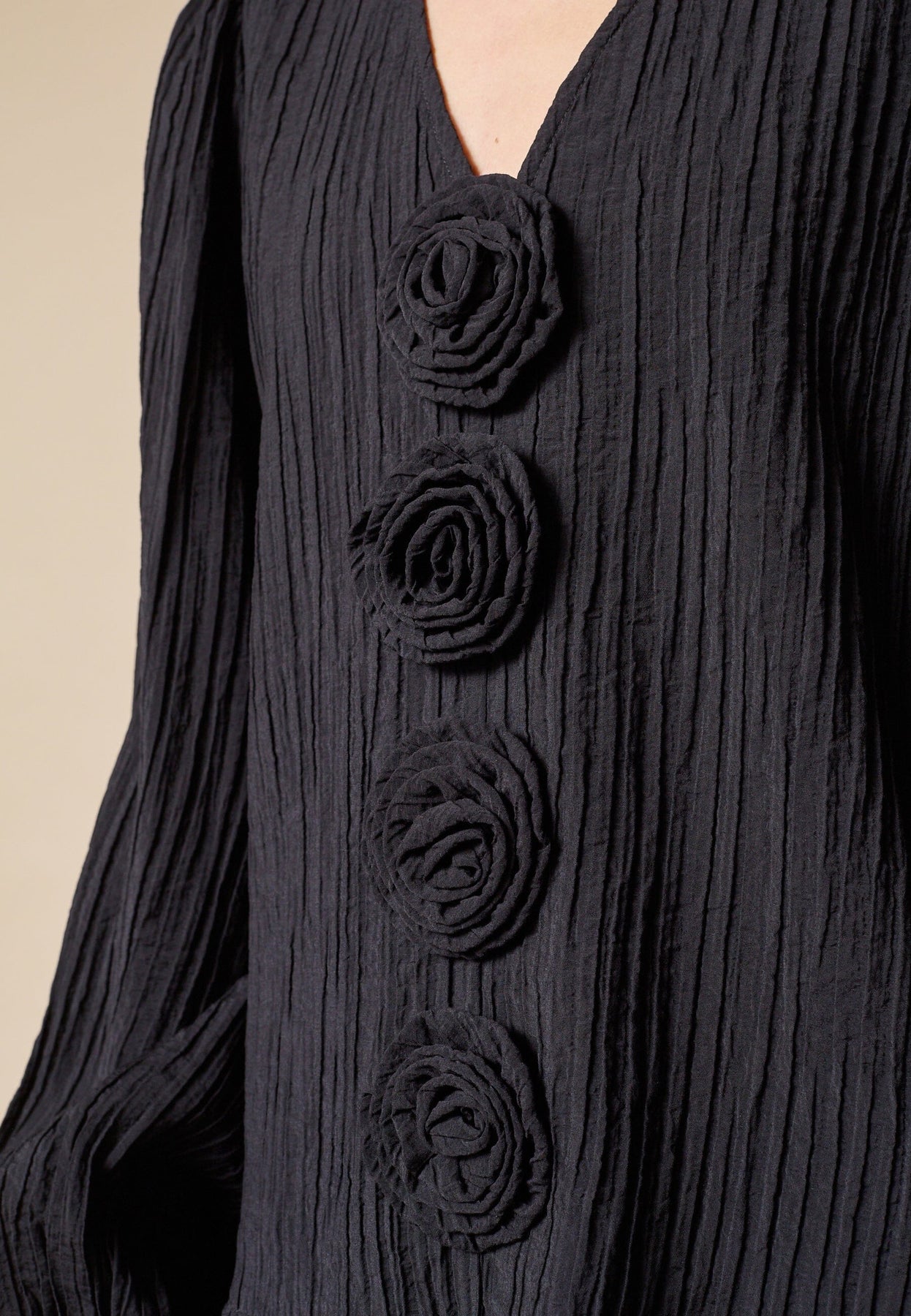 Czarna bluzka od Love & Divine z czterema dekoracyjnymi, kwiatopodobnymi detalami z przodu, długimi rękawami z lekko bufowanymi mankietami oraz dekoltem w kształcie litery V.