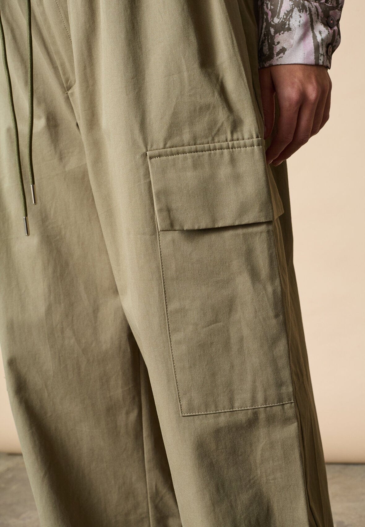Oliwkowozielone spodnie od Love & Divine, wykonane z bawełny. Spodnie mają luźny krój i długość do kostek, duże kieszenie po bokach oraz regulowany troczek w pasie.