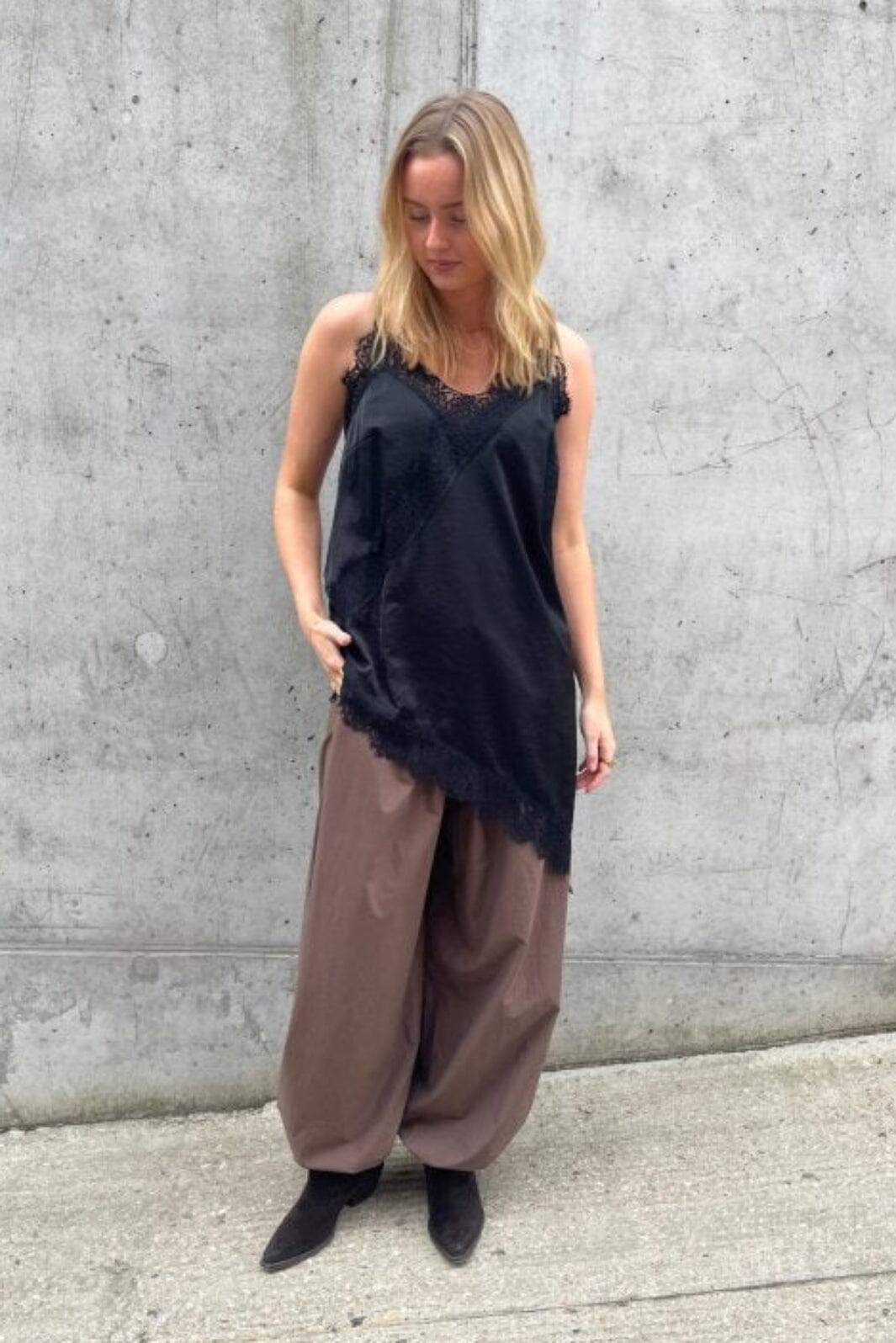 Czarny top marki Love & Divine z koronkowymi detalami wzdłuż dekoltu oraz asymetryczną koronkową lamówką u dołu. Top ma cienkie ramiączka i dekolt w kształcie litery V.