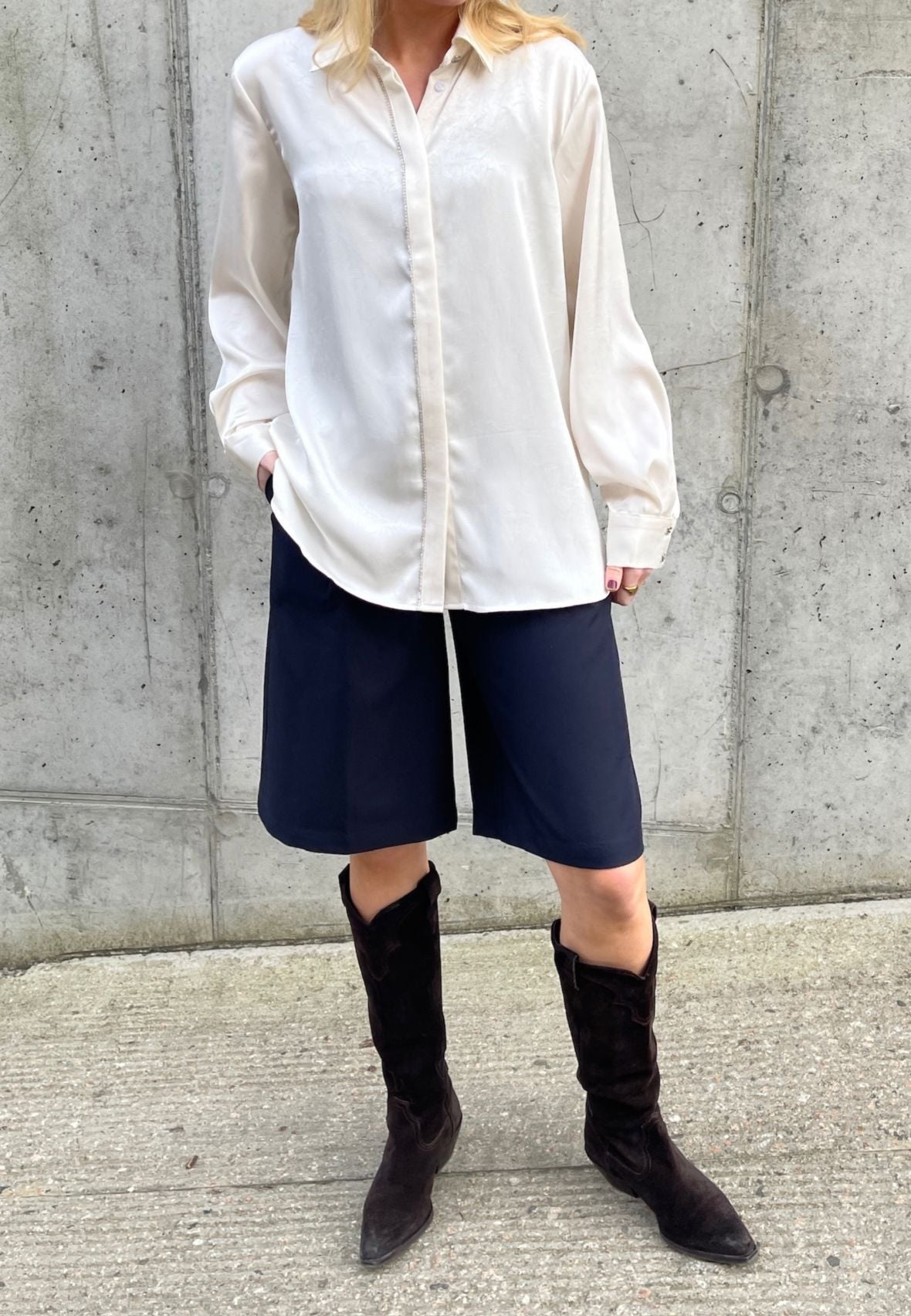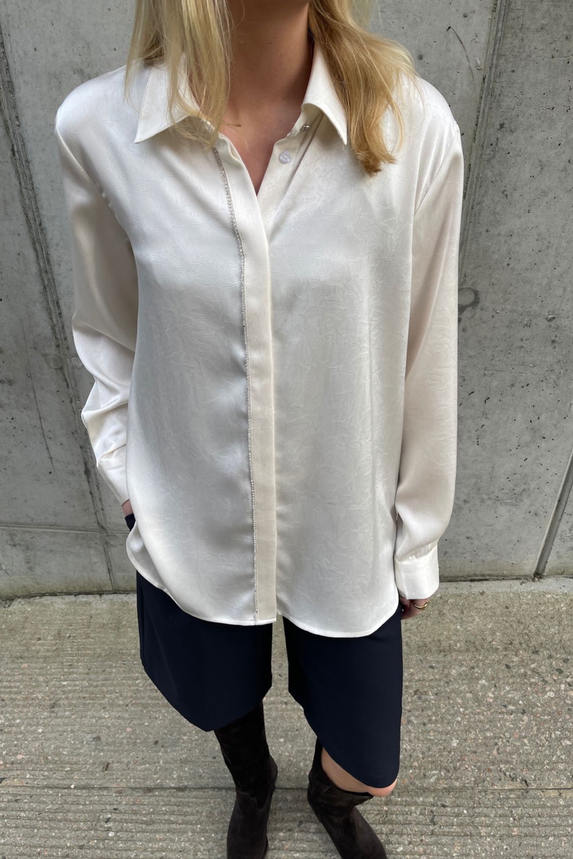 Kremowa koszula od Love & Divine z klasycznym kołnierzykiem i długimi rękawami. Koszula ma cekiny wzdłuż zapięcia na guziki oraz mankiety zapinane na guziki.