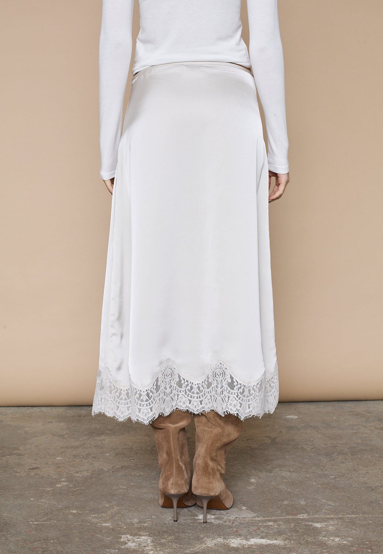 Długa spódnica marki Love & Divine w białym i kremowym odcieniu. Spódnica ma gładką, błyszczącą powierzchnię z koronkowym wykończeniem wzdłuż dołu.