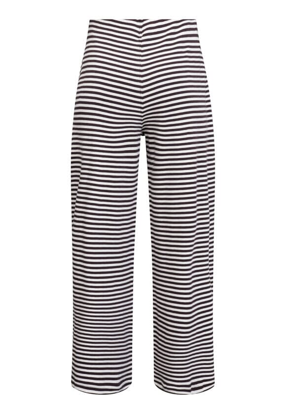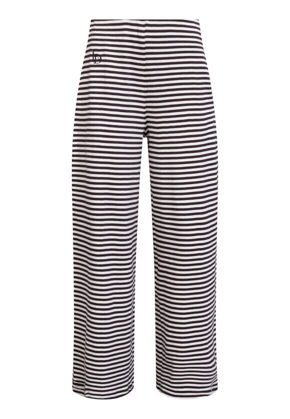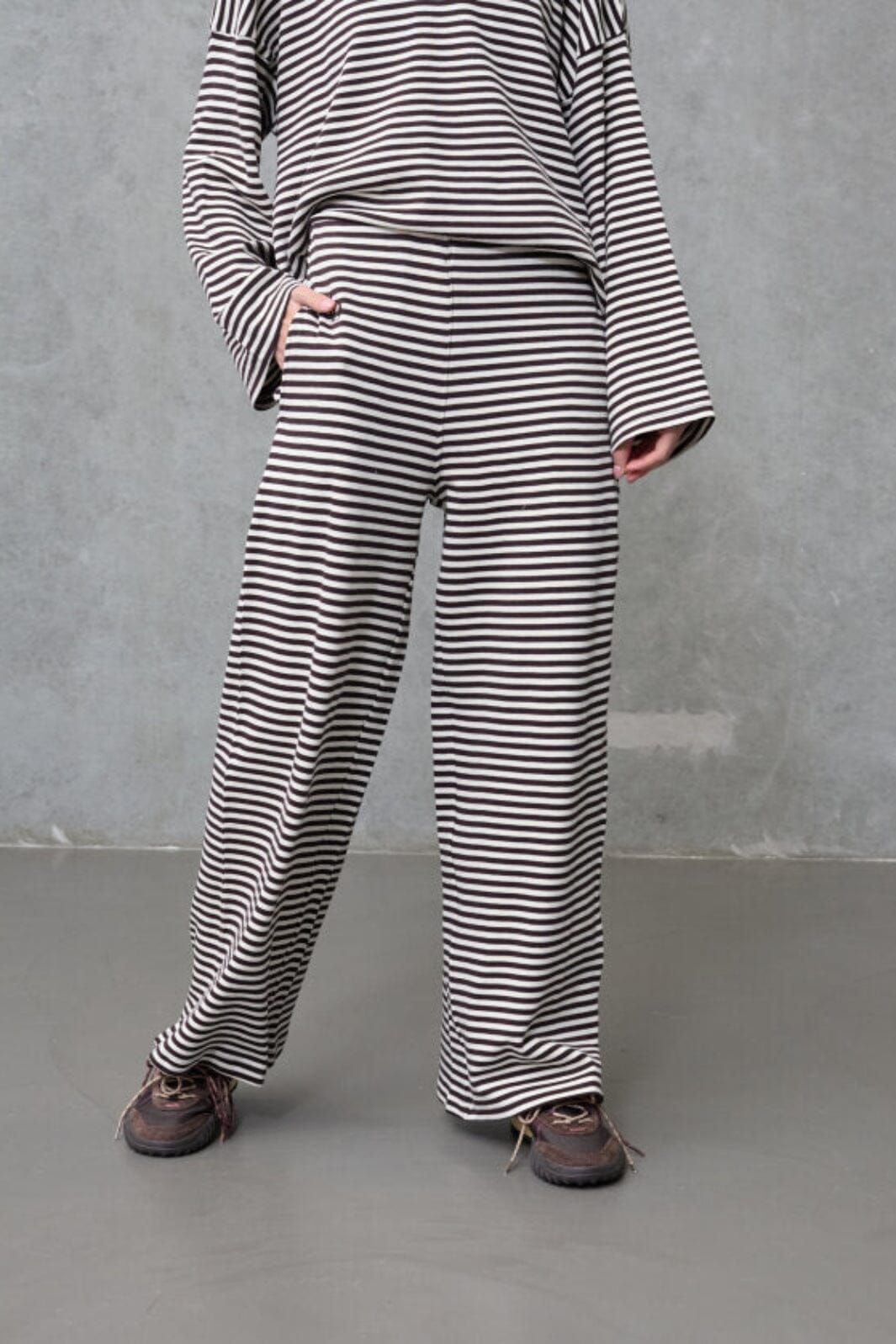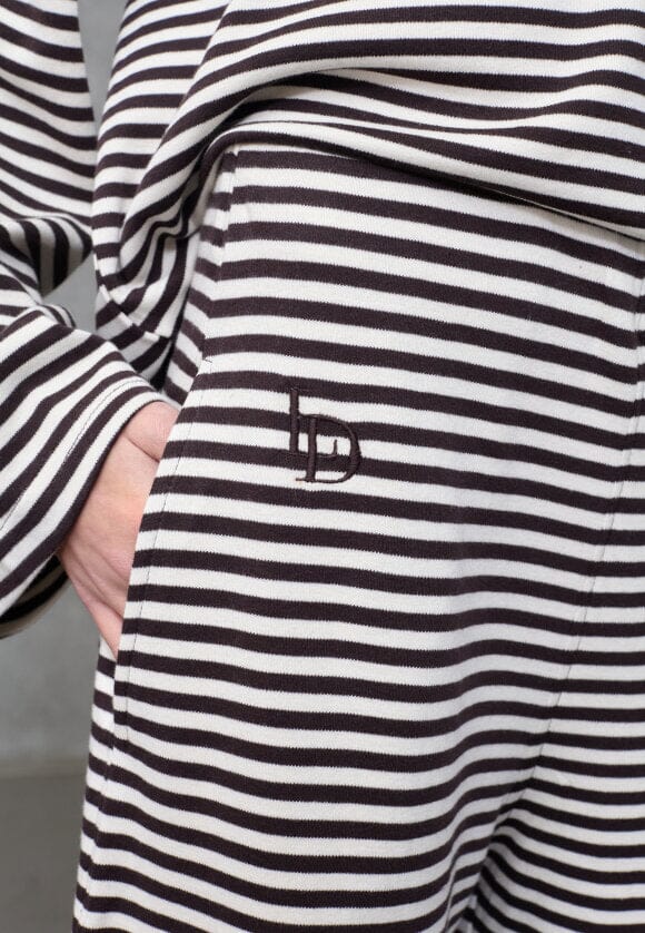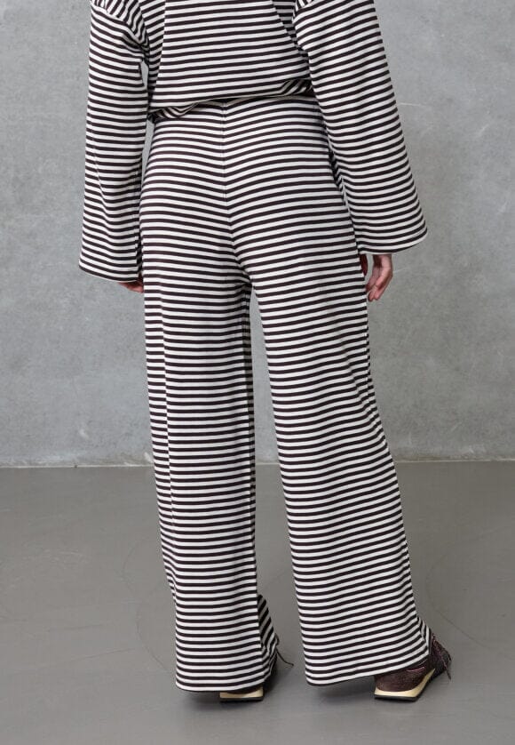 Spodnie w paski od Love & Divine w kolorze kremowym i brązowym. Spodnie wykonane są w 100% z bawełny i mają luźny krój oraz długość sięgającą podłogi.