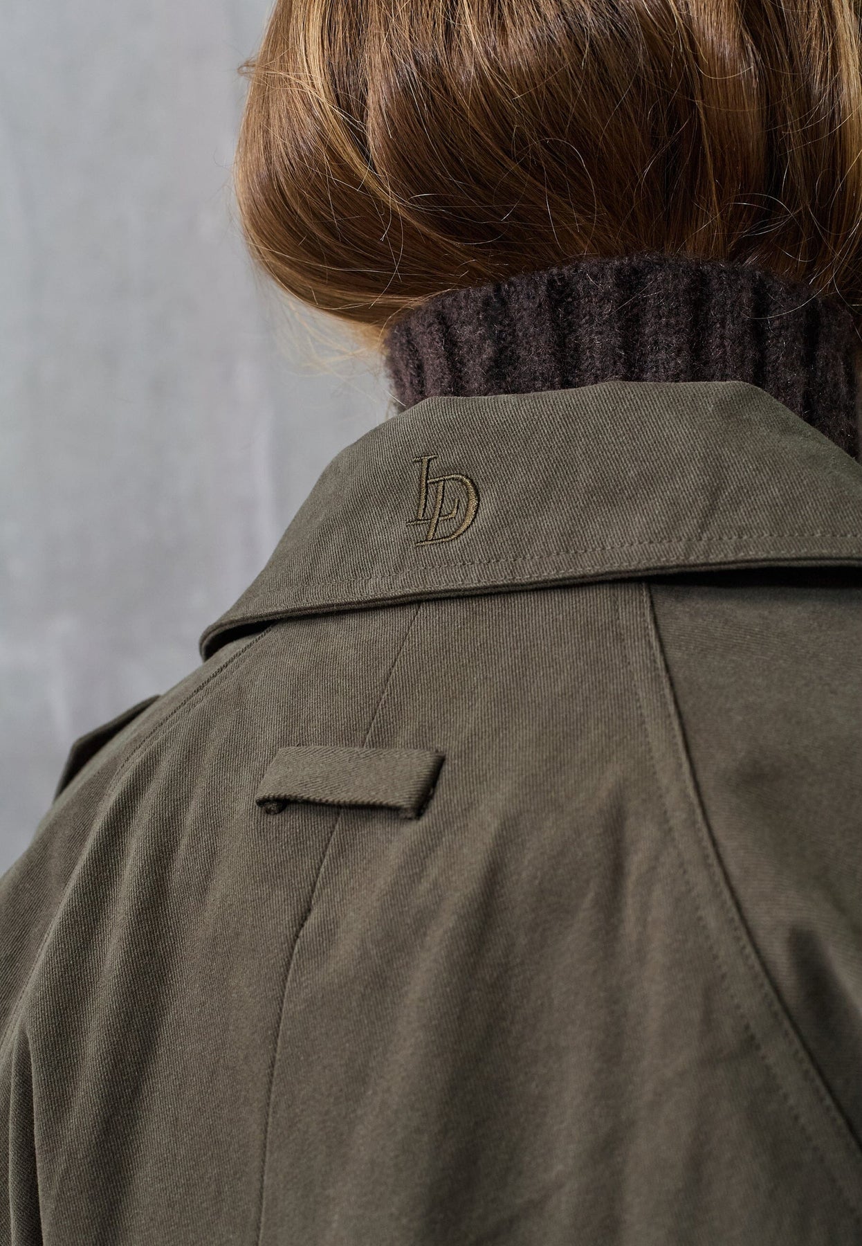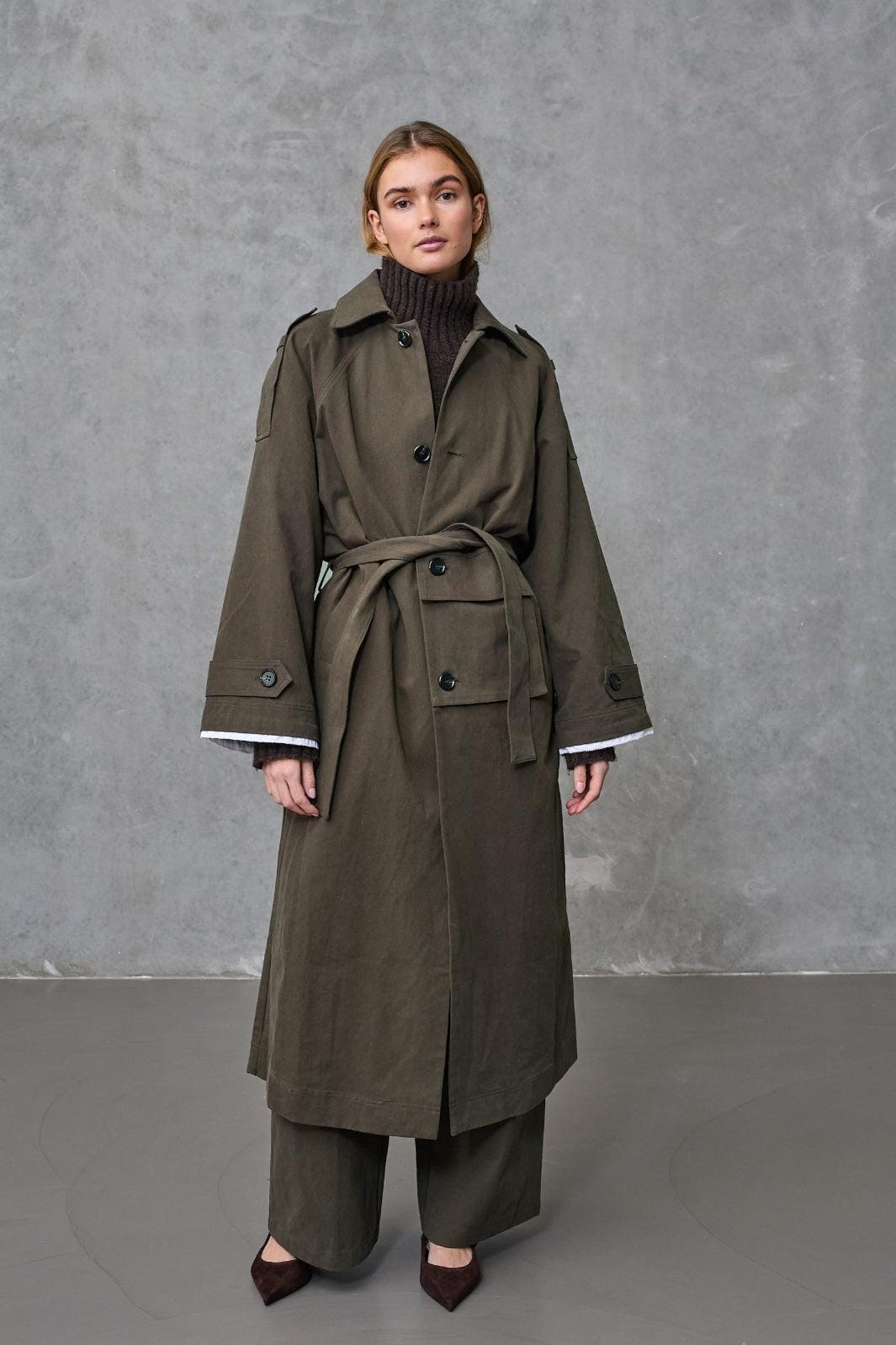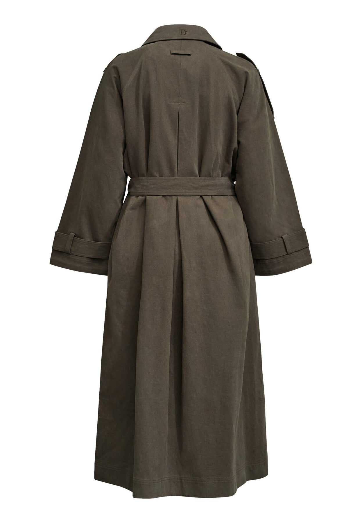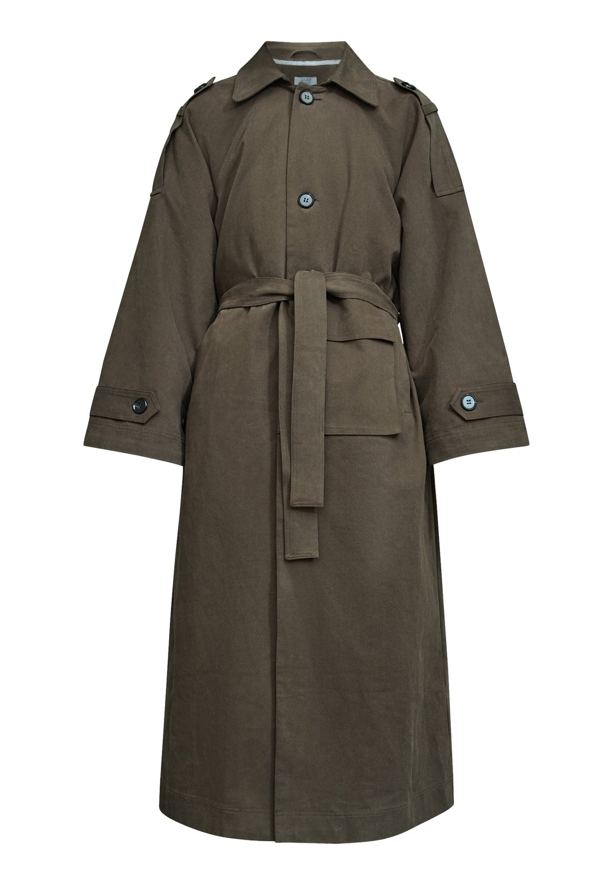 Brązowy płaszcz marki Love & Divine, wykonany w 100% z bawełny. Płaszcz ma długą długość, z guzikami z przodu i wiązanym paskiem w talii.