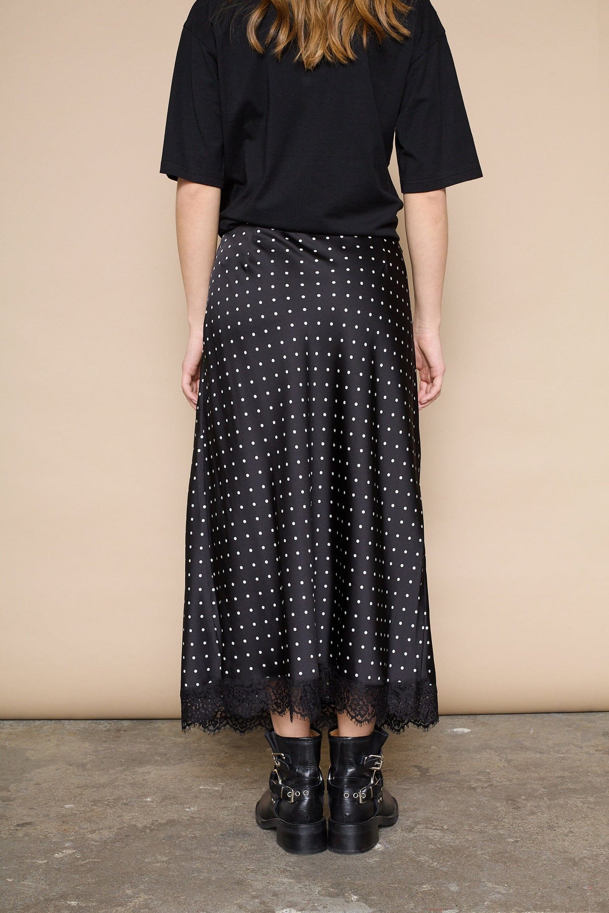 Czarna spódnica Love & Divine w białe kropki. Spódnica ma koronkowe wykończenie u dołu i sięga do połowy łydki.