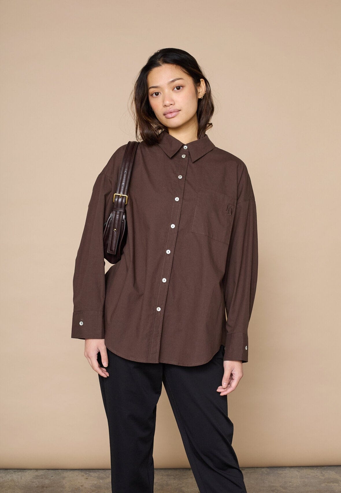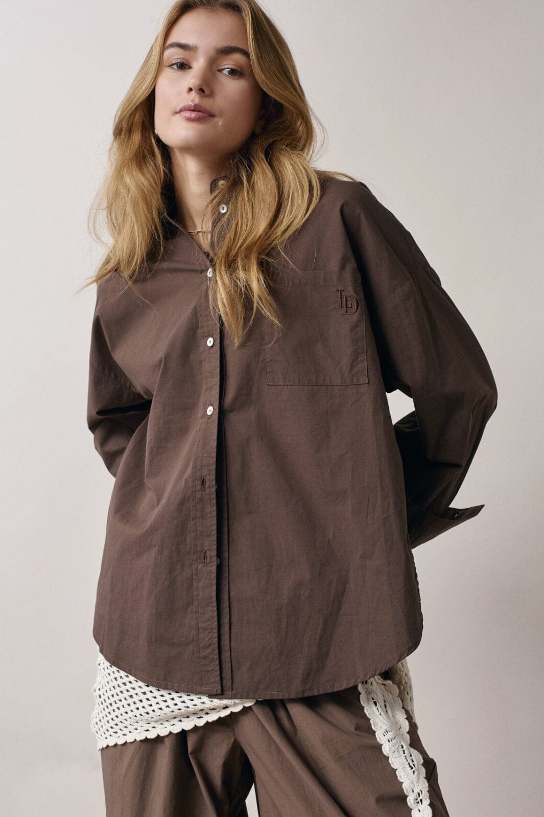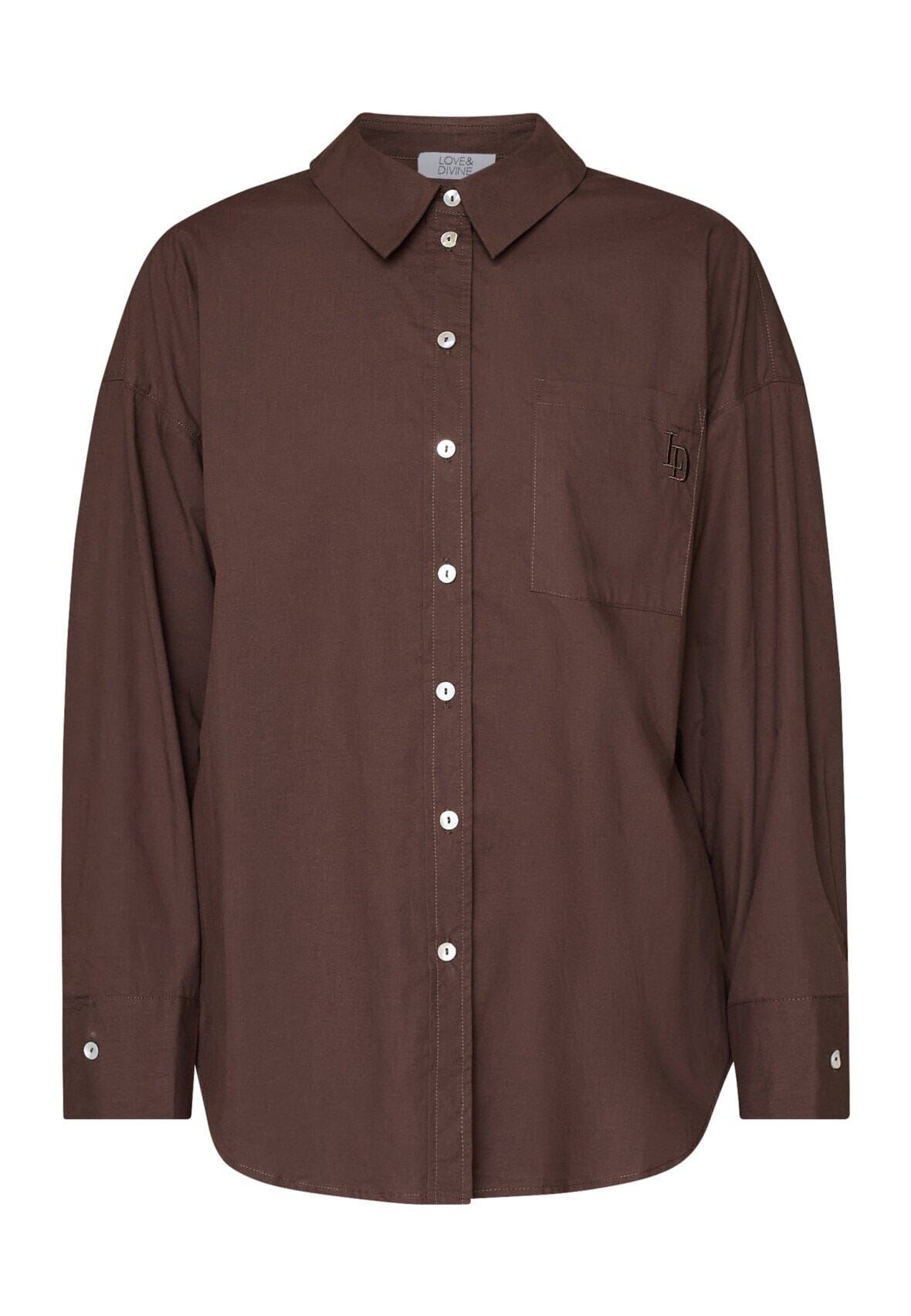 Brązowa koszula Love & Divine z haftem na kieszeni na piersi. Koszula ma oversize’owy krój, długie rękawy i zapięcie na guziki z przodu.