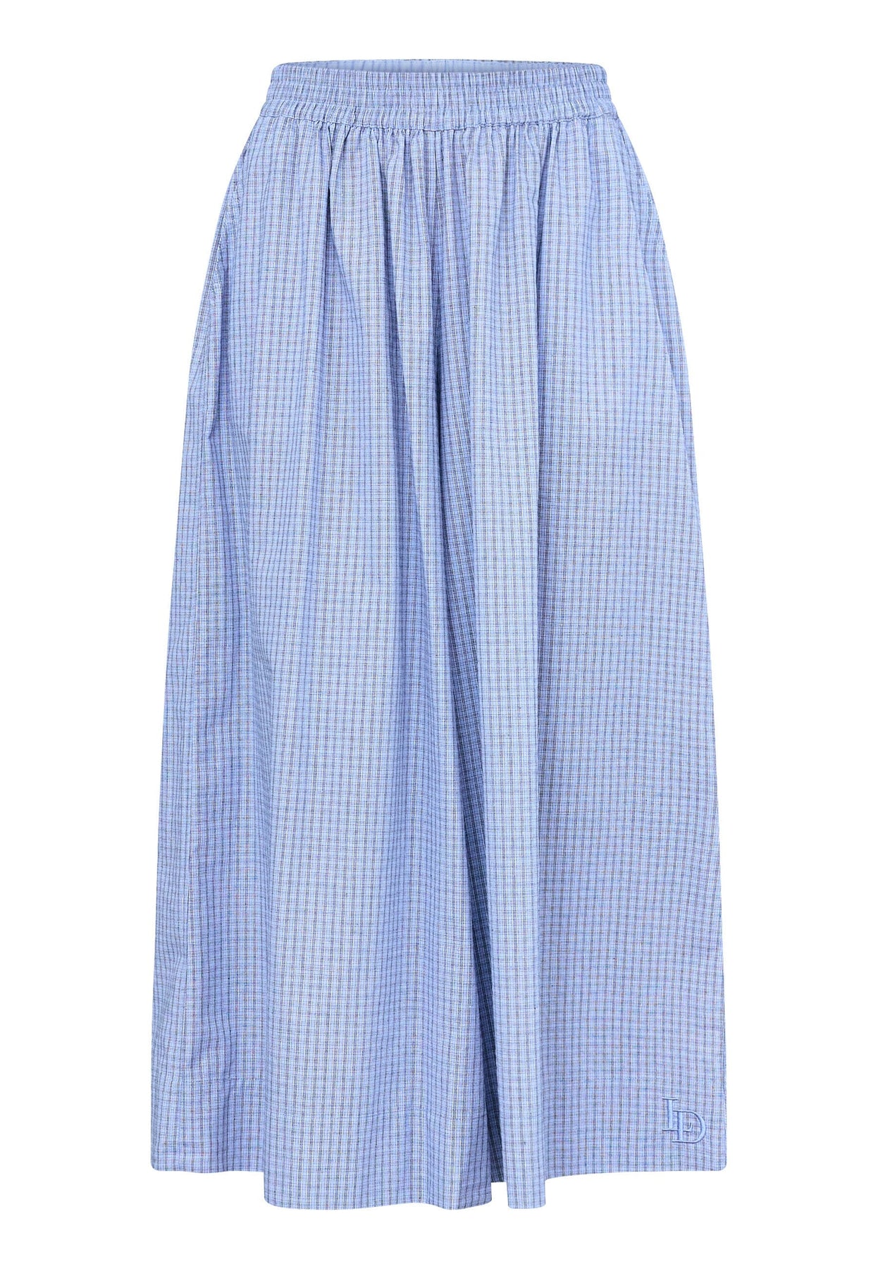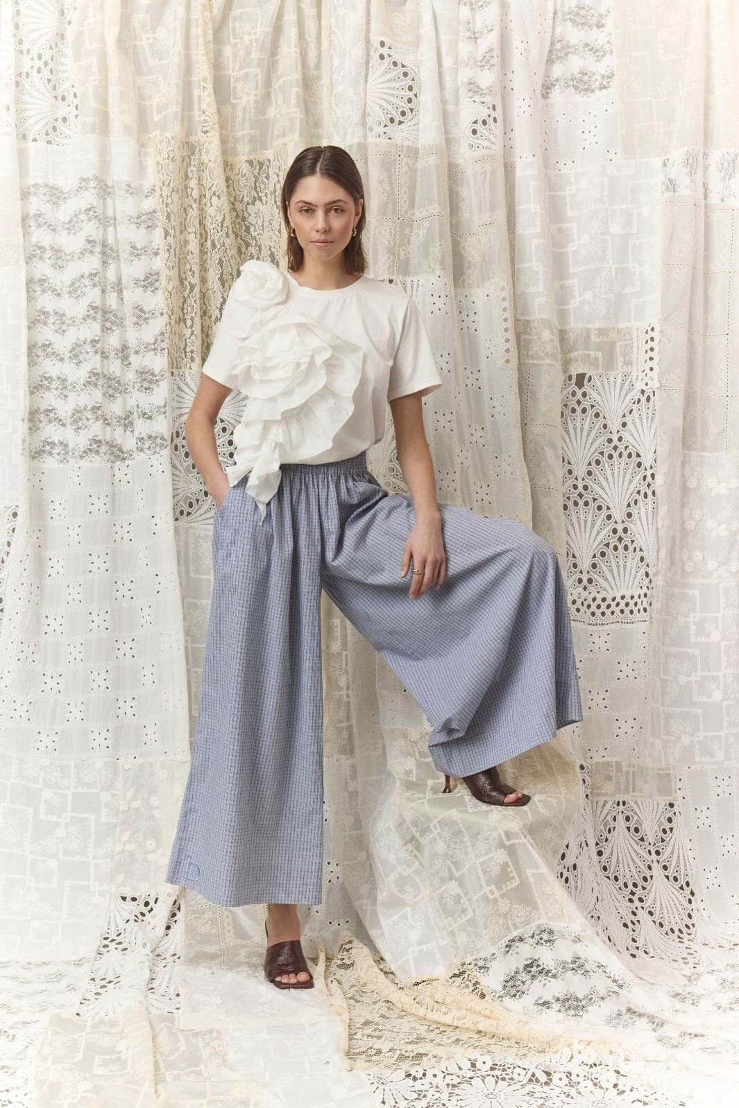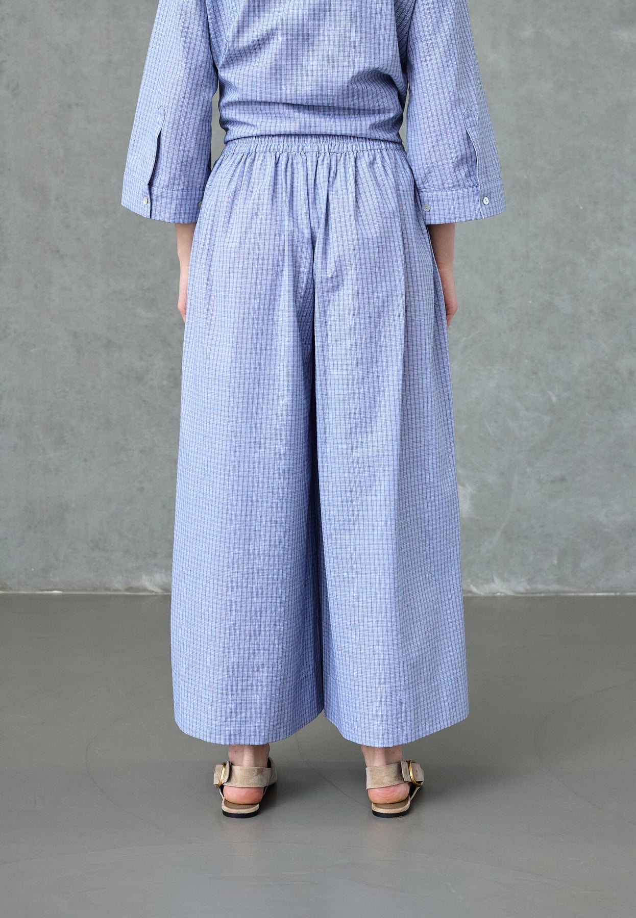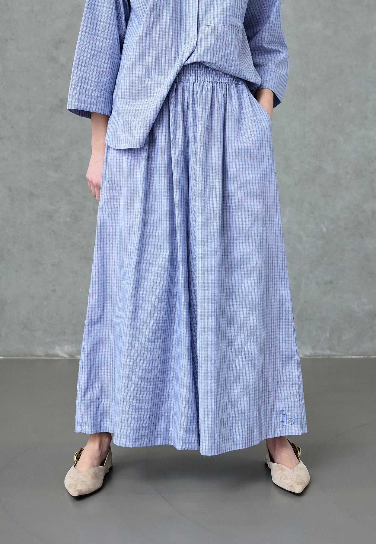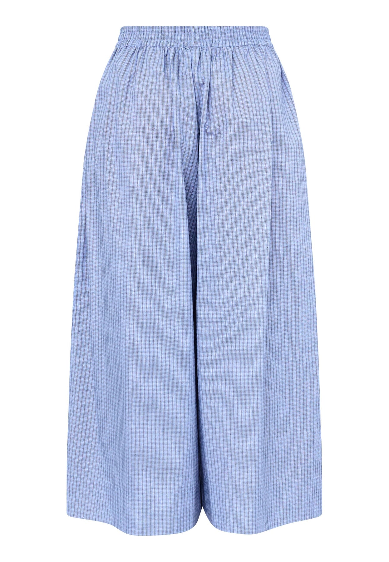 Szerokie spodnie od Love & Divine w niebieski kraciasty wzór. Spodnie wykonane są w 100% z bawełny i mają wysoki stan z elastyczną gumką w pasie.