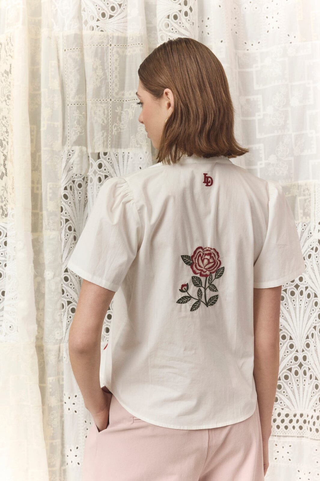 Biała koszula marki Love & Divine, wykonana w 100% z bawełny. Koszula ma haftowane motywy słońca, kwiatu i wiśni oraz falbany.