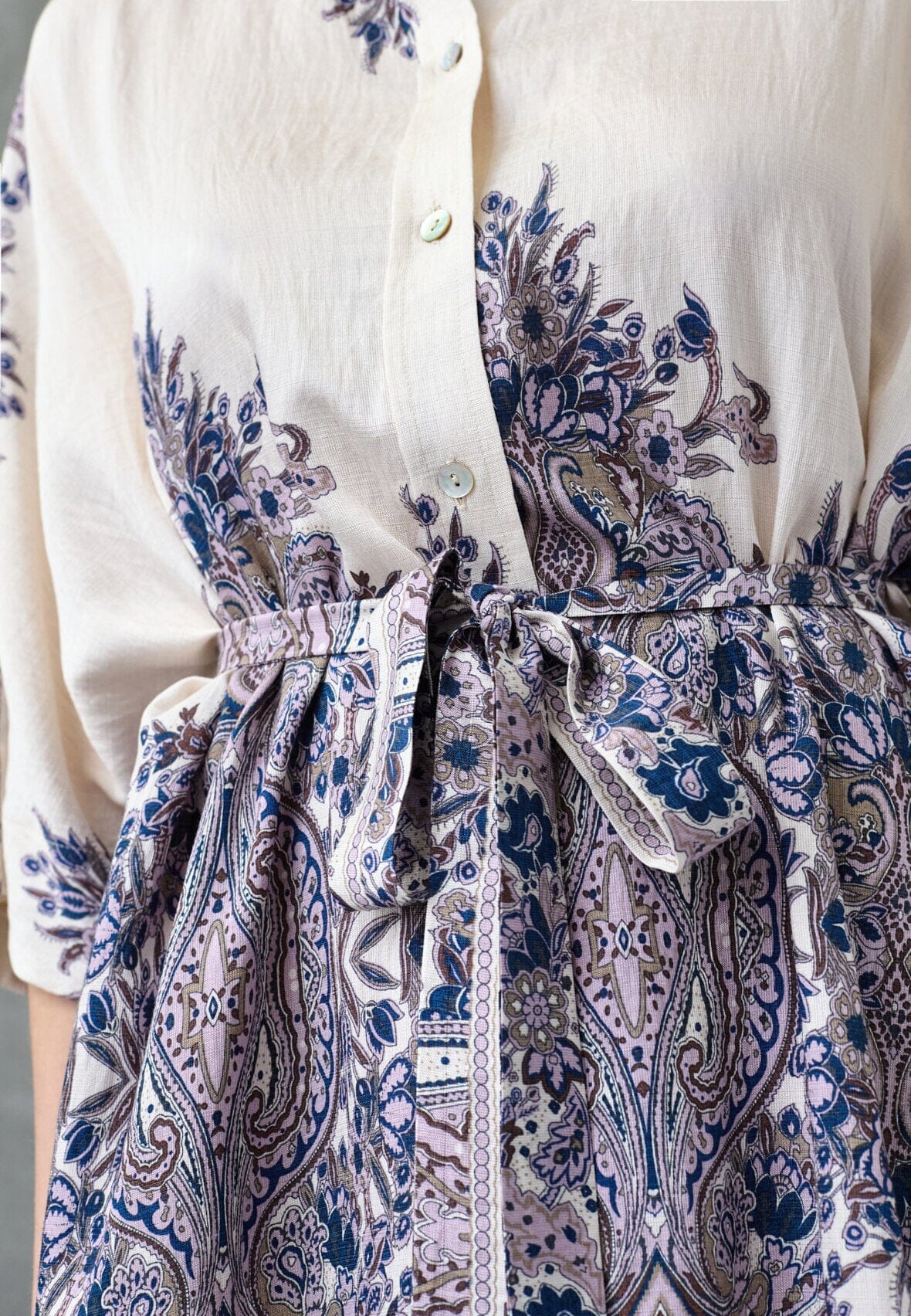 Sukienka marki Love & Divine w kolorze kremowym i białym z wzorem paisley w odcieniach szampana i niebieskiego. Sukienka ma zapięcie na guziki z przodu oraz rękawy 3/4.