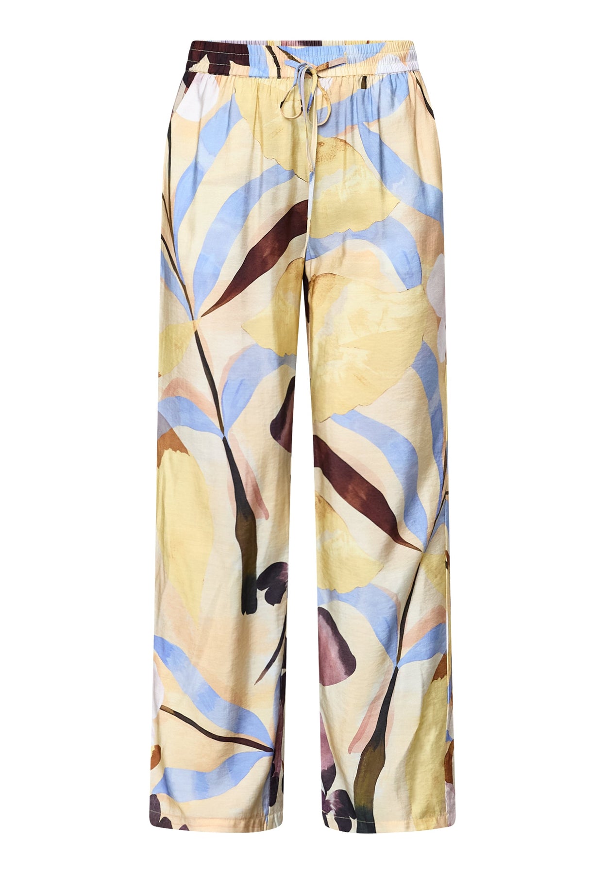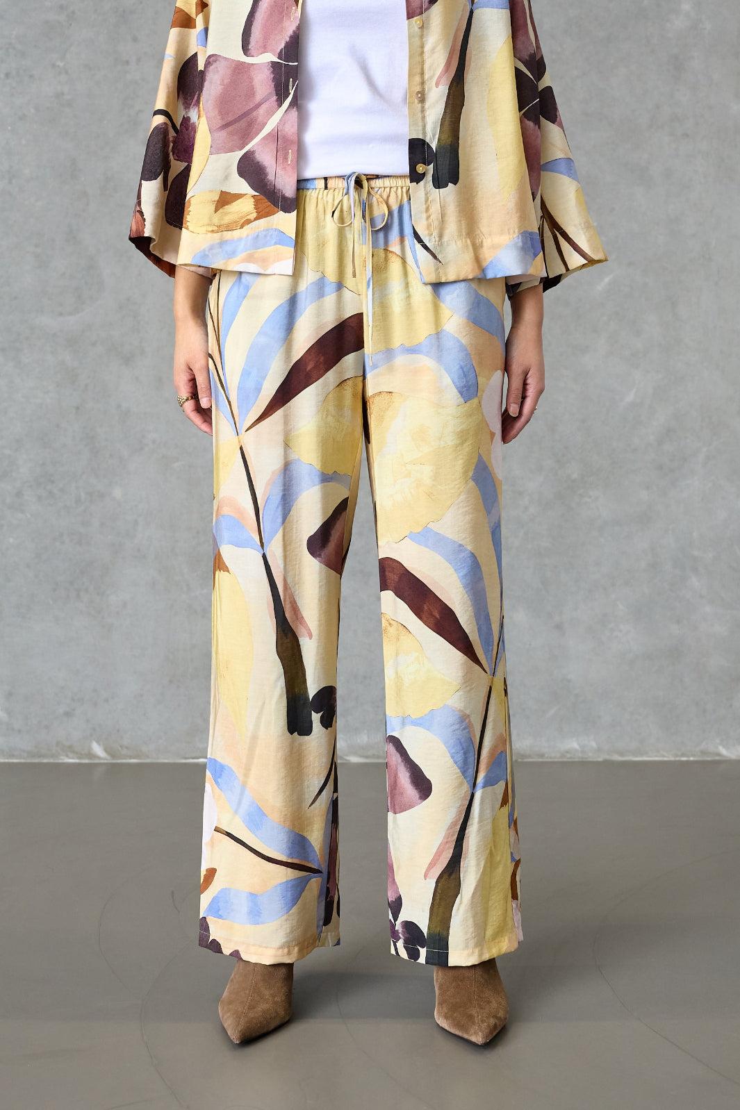 Spodnie Love & Divine z kwiatowym wzorem w żółtych, niebieskich, brązowych i fioletowych odcieniach. Spodnie mają luźny krój i sięgają do kostek.