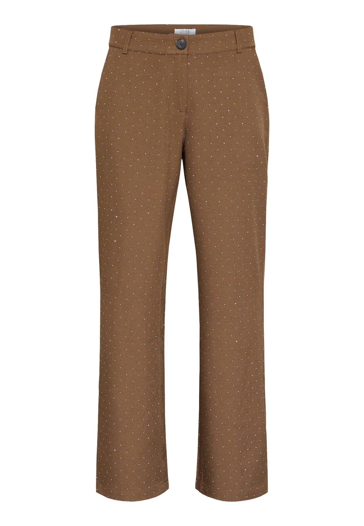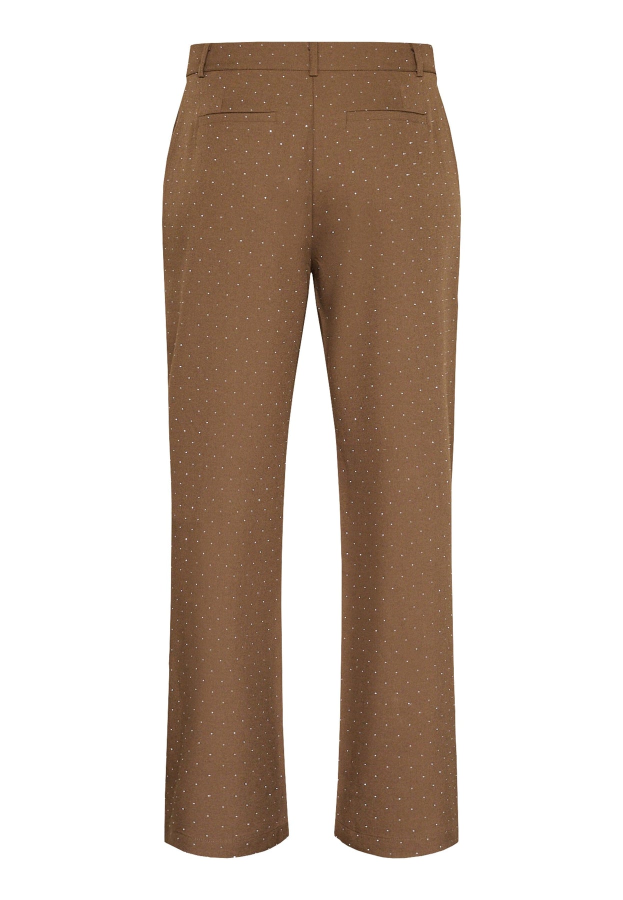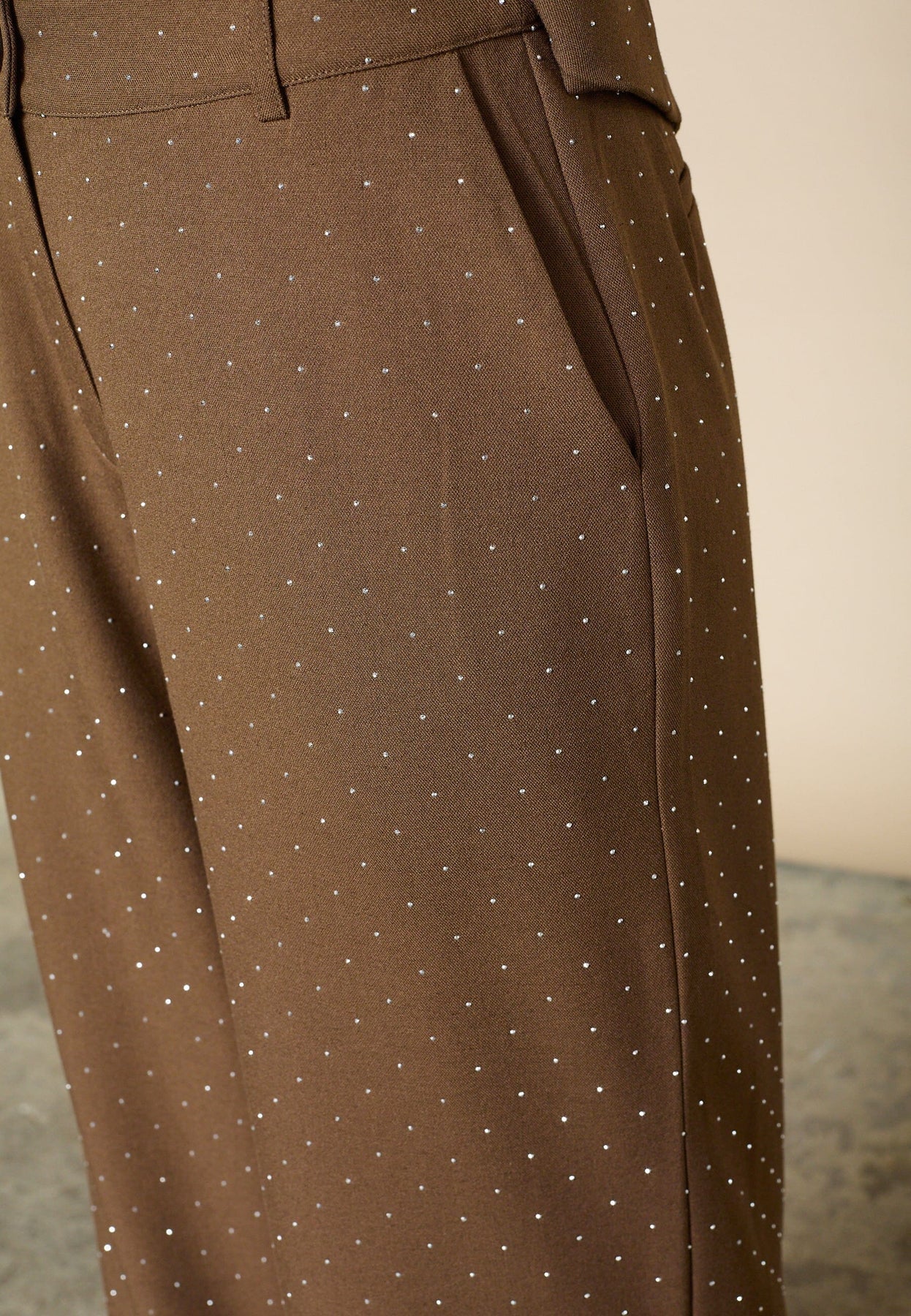 Brązowe spodnie od Love & Divine z drobnymi zdobieniami z cyrkonii na całym materiale. Spodnie są częścią garnituru z dopasowaną marynarką.